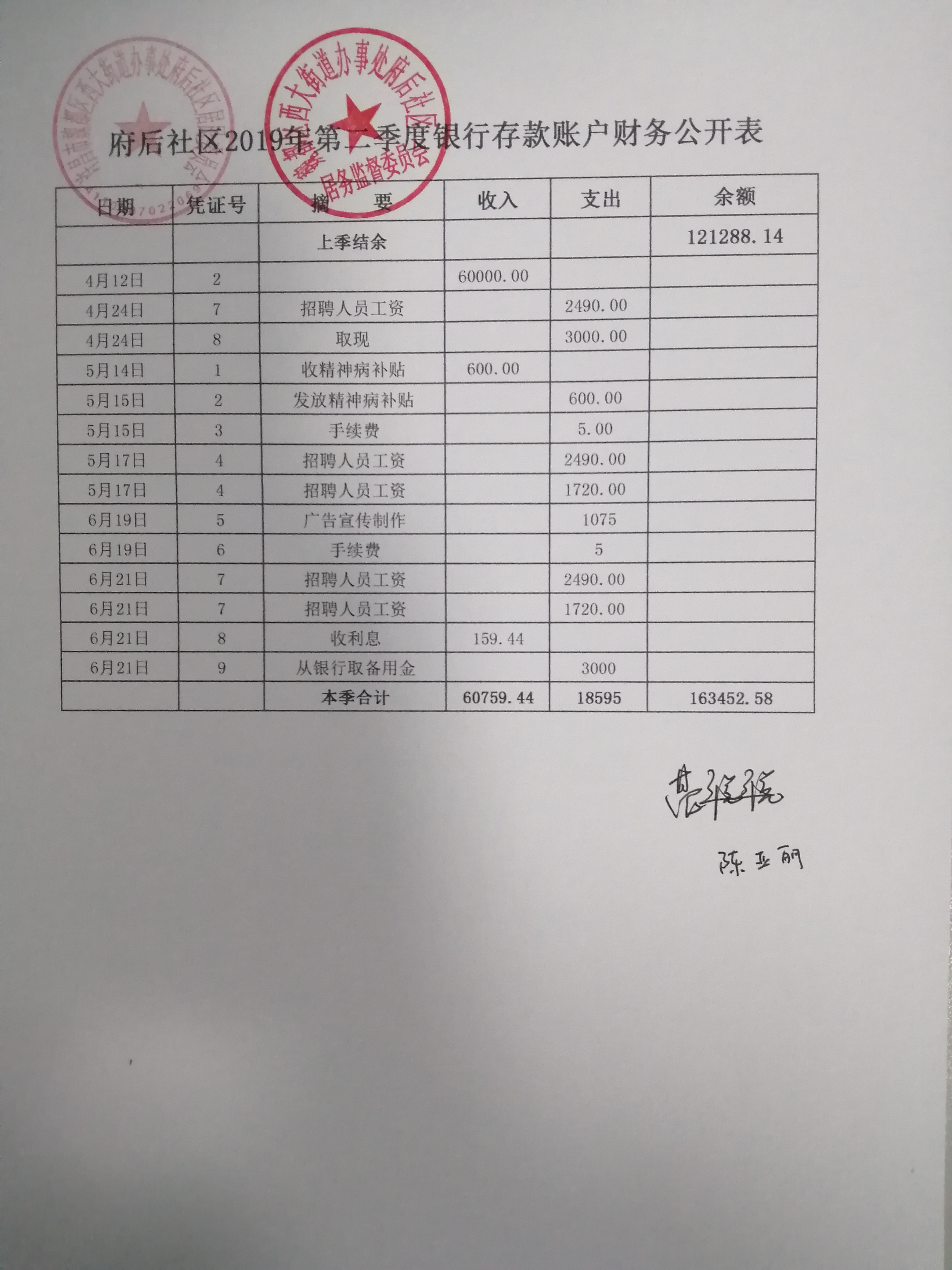 西大办事处府后社区2019年第二季度现金、银行存款账户公开表