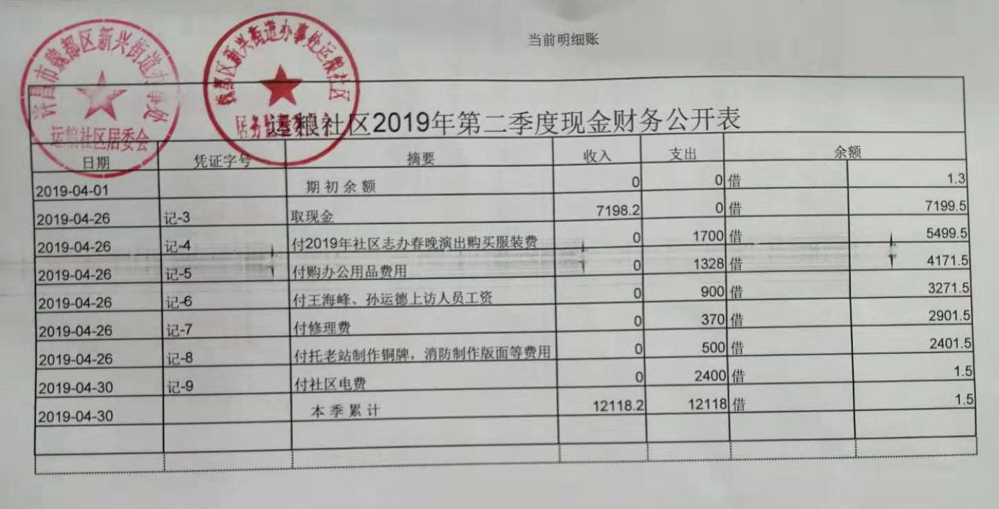 新兴办事处运粮社区2019年第二季度现金、银行存款账户公示表