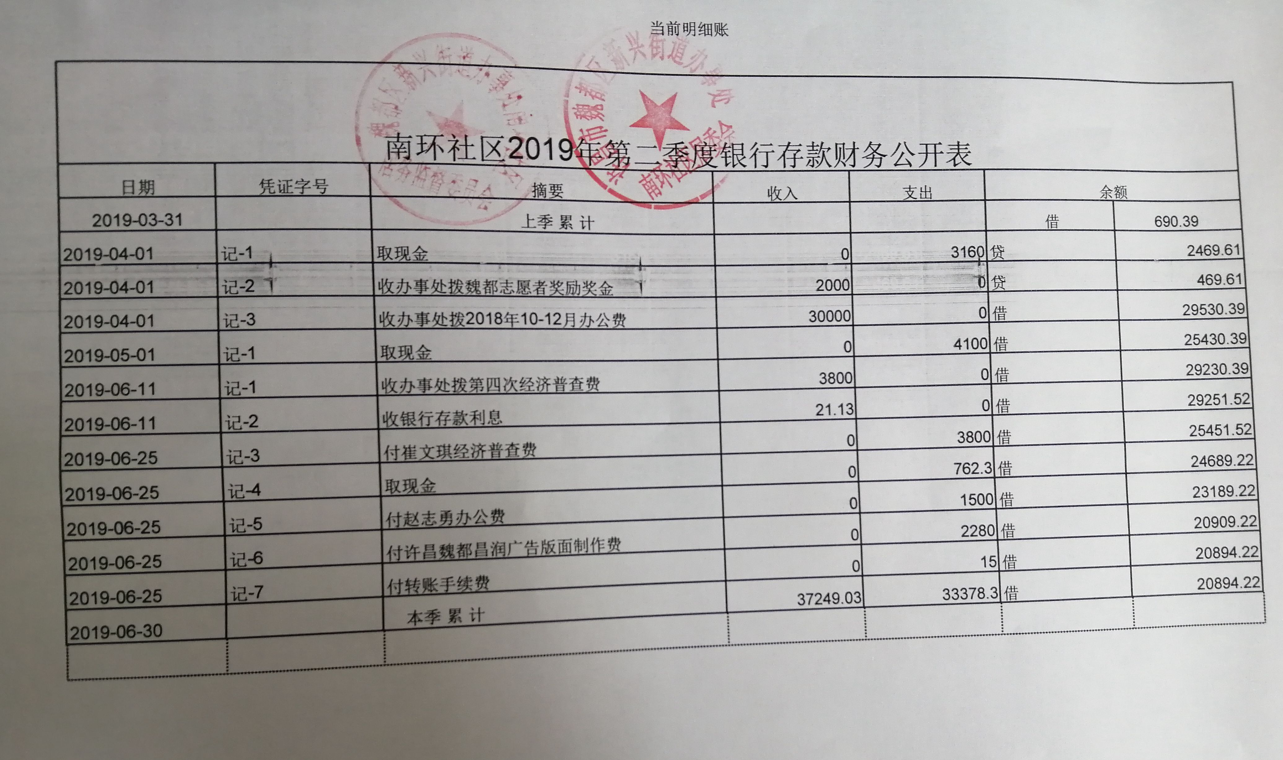 新兴办事处南环社区2019年第二季度现金、银行存款账户公开表