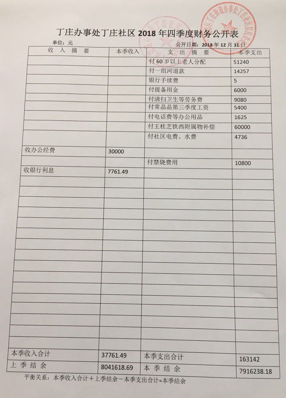 丁庄办事处丁庄社区2018年第四季度财务公开表