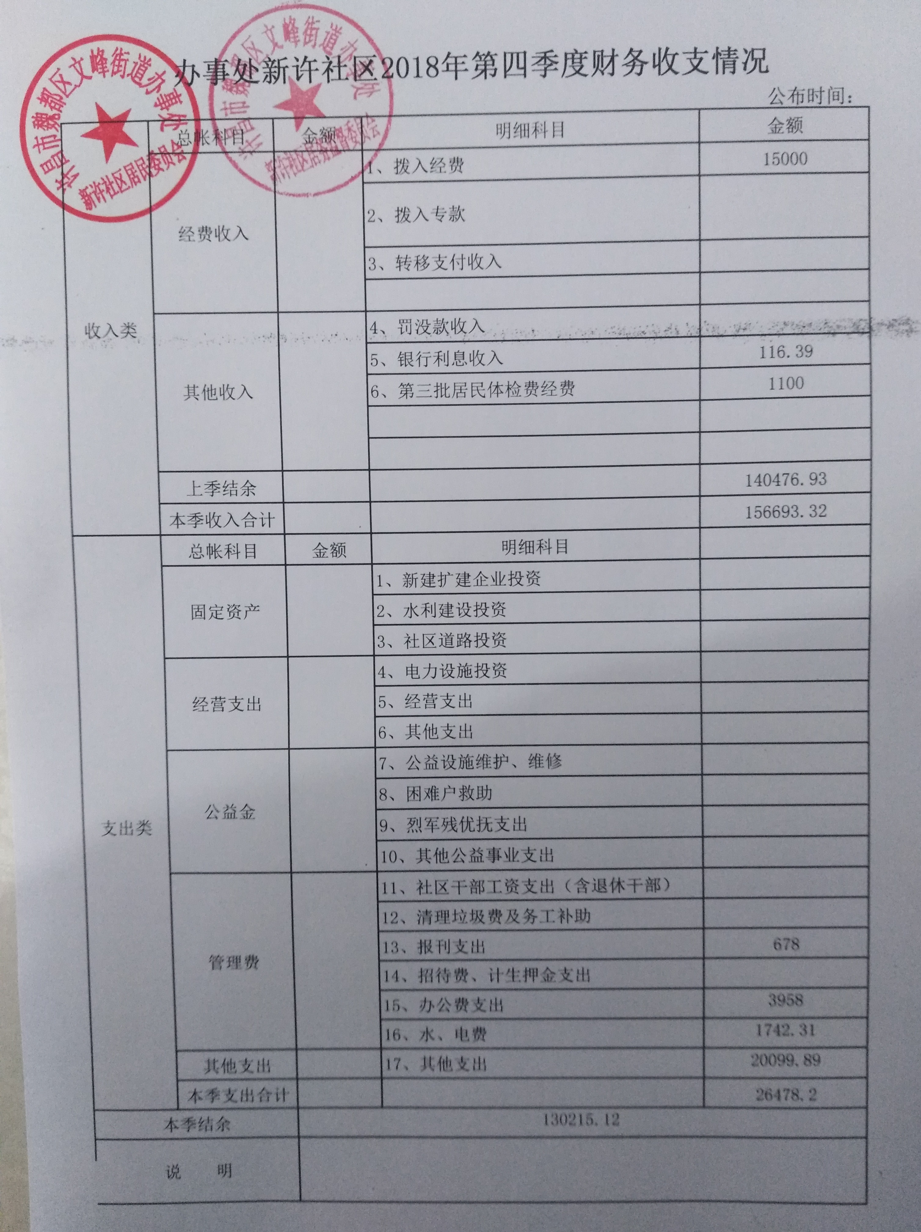文峰办事处新许社区2018年第四季度财务公开表