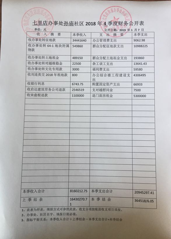 七里店办事处孙庙社区2018年第四季度财务公开表