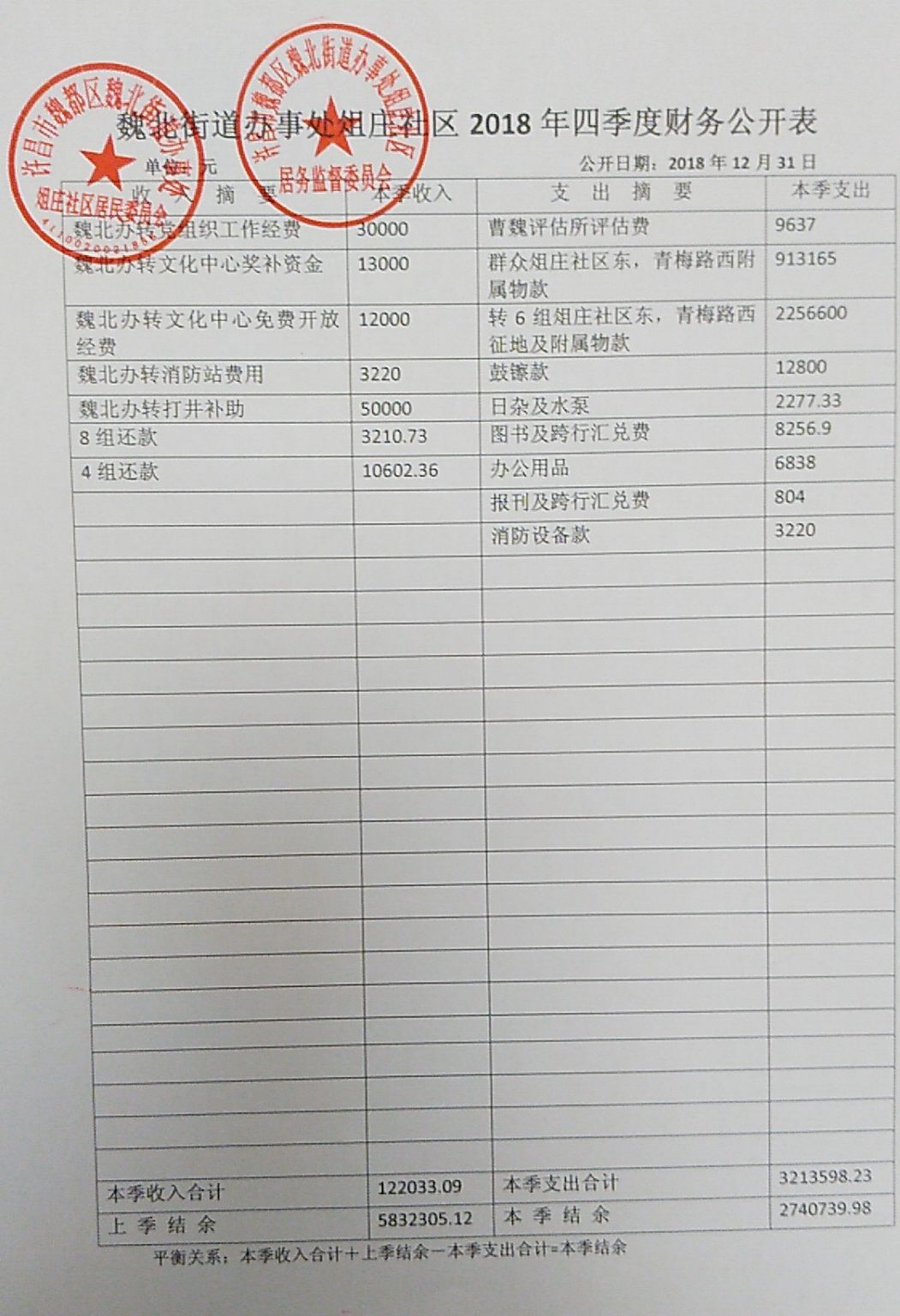 魏北办事处俎庄社区2018年第四季度财务公开表