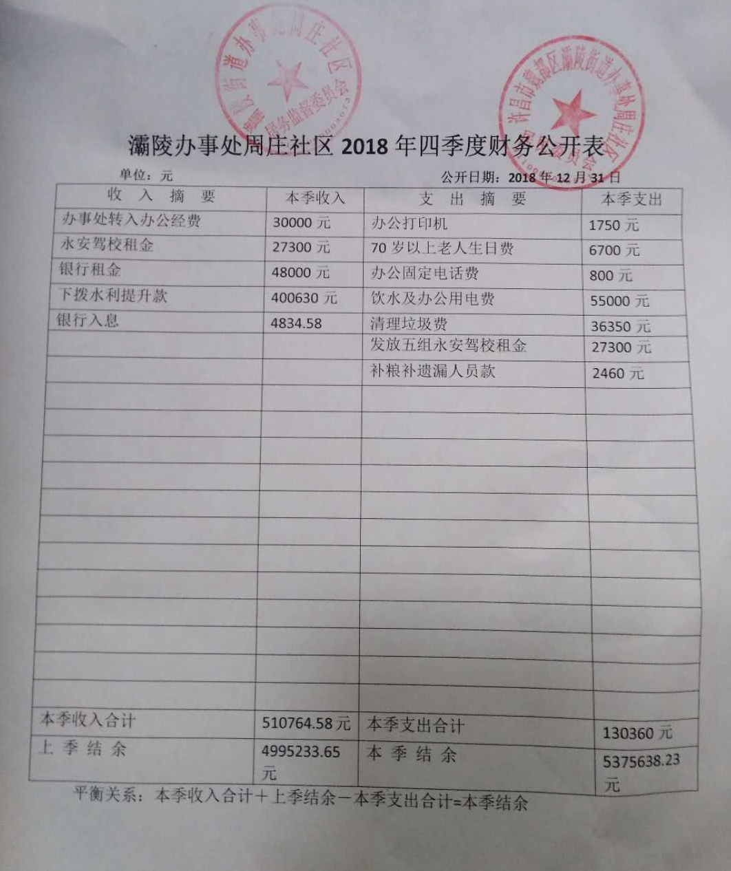 灞陵办事处周庄社区2018年第四季度财务公开表