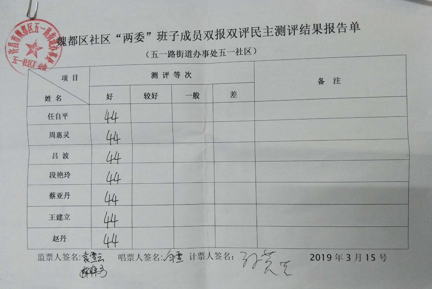 五一路办事处五一社区“双报双评”评议结果