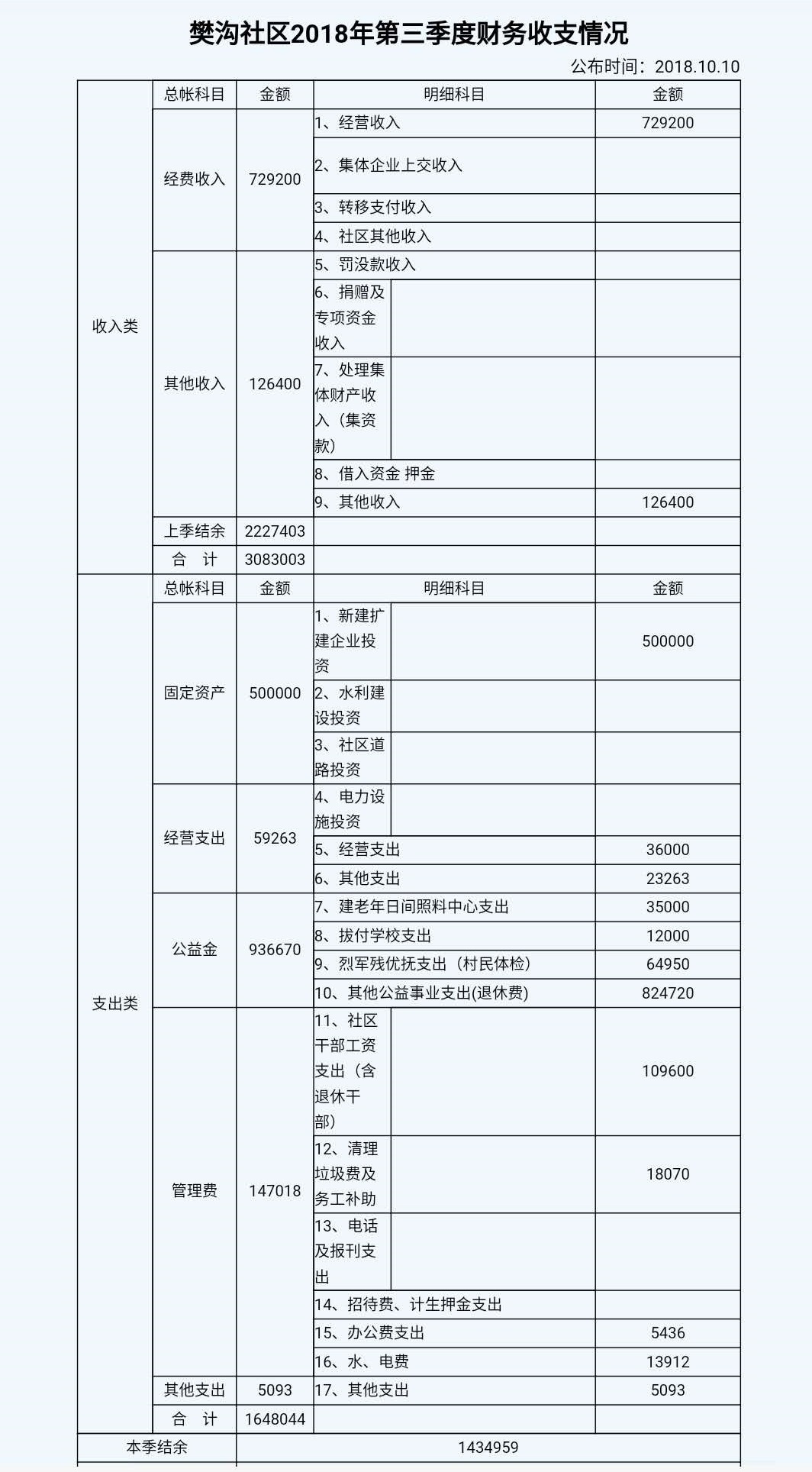 五一路办事处樊沟社区2018年第三季度财务公开表