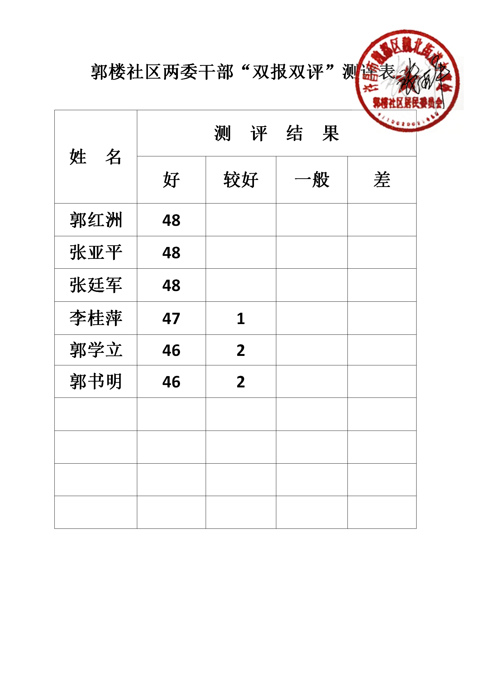 魏北办事处郭楼社区“双报双评”评议结果