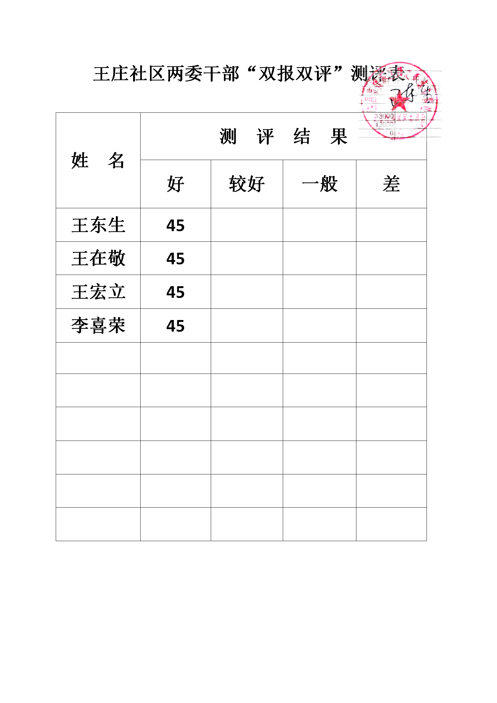 魏北办事处王庄社区“双报双评”评议结果