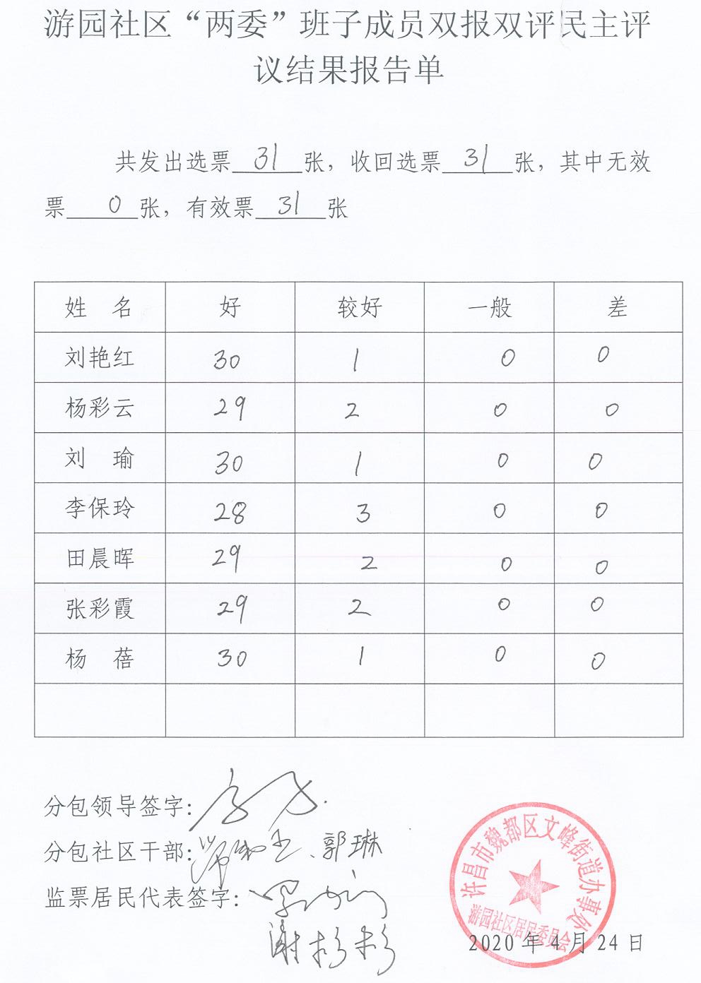 文峰办事处游园社区2019年“双报双评”评议结果公示表