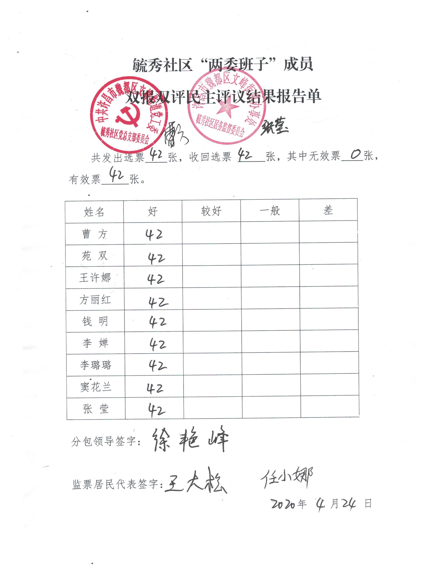 文峰办事处毓秀社区2019年社区“双报双评” 评议结果公示表