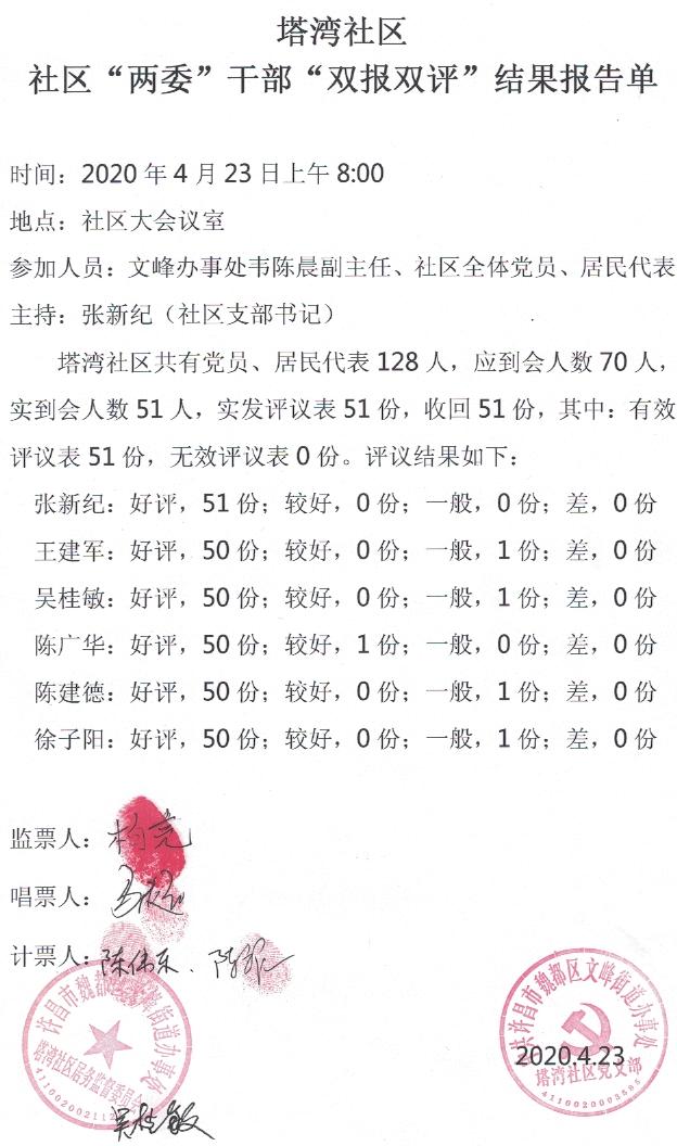 文峰办事处塔湾社区2019年“双报双评”评议结果公示表