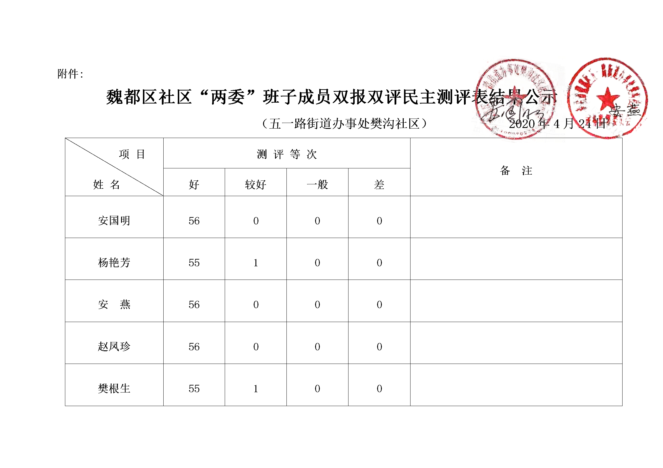 五一路办事处樊沟社区“双报双评”评议结果公示