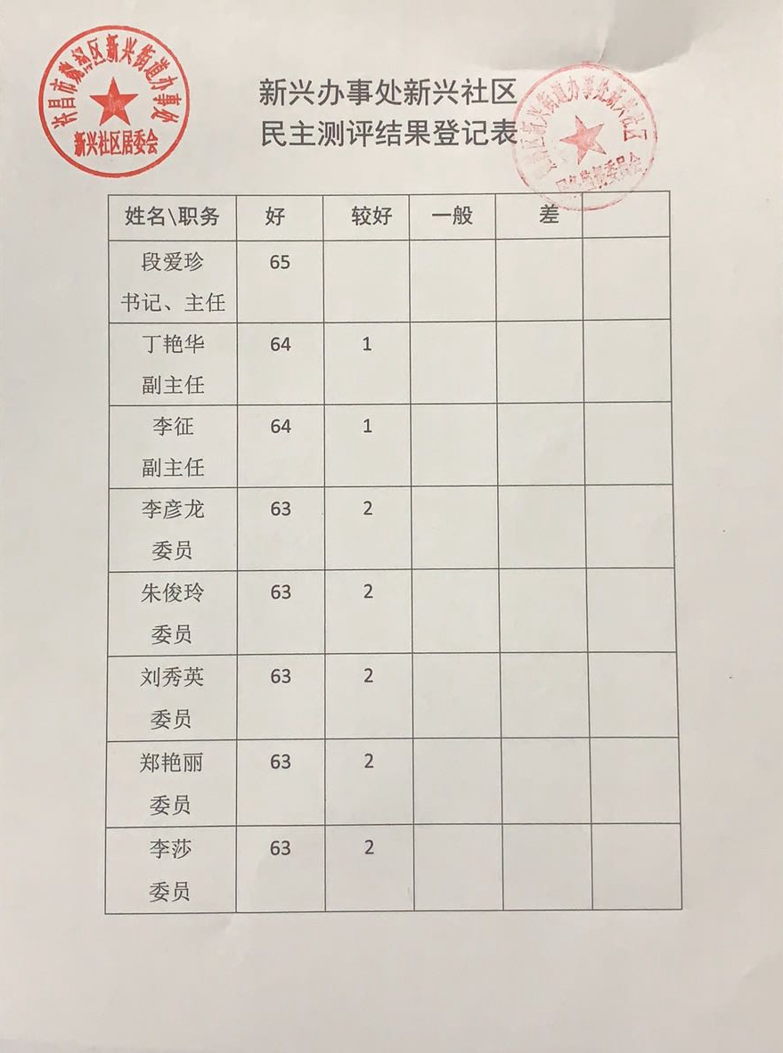 新兴办事处新兴社区2019年“双报双评”评议结果公示表