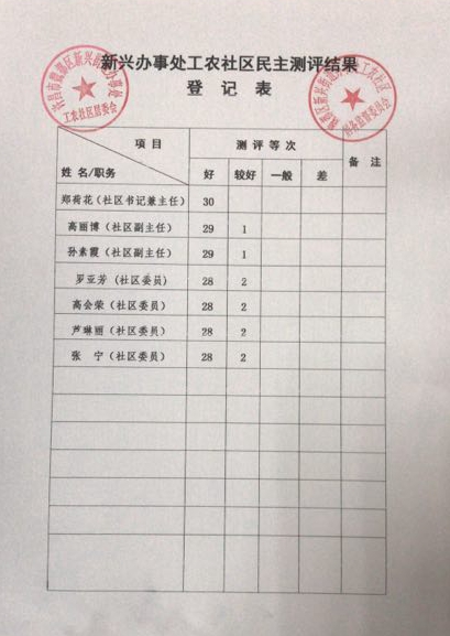 五一路办事处樊沟社区“双报双评”评议结果公示