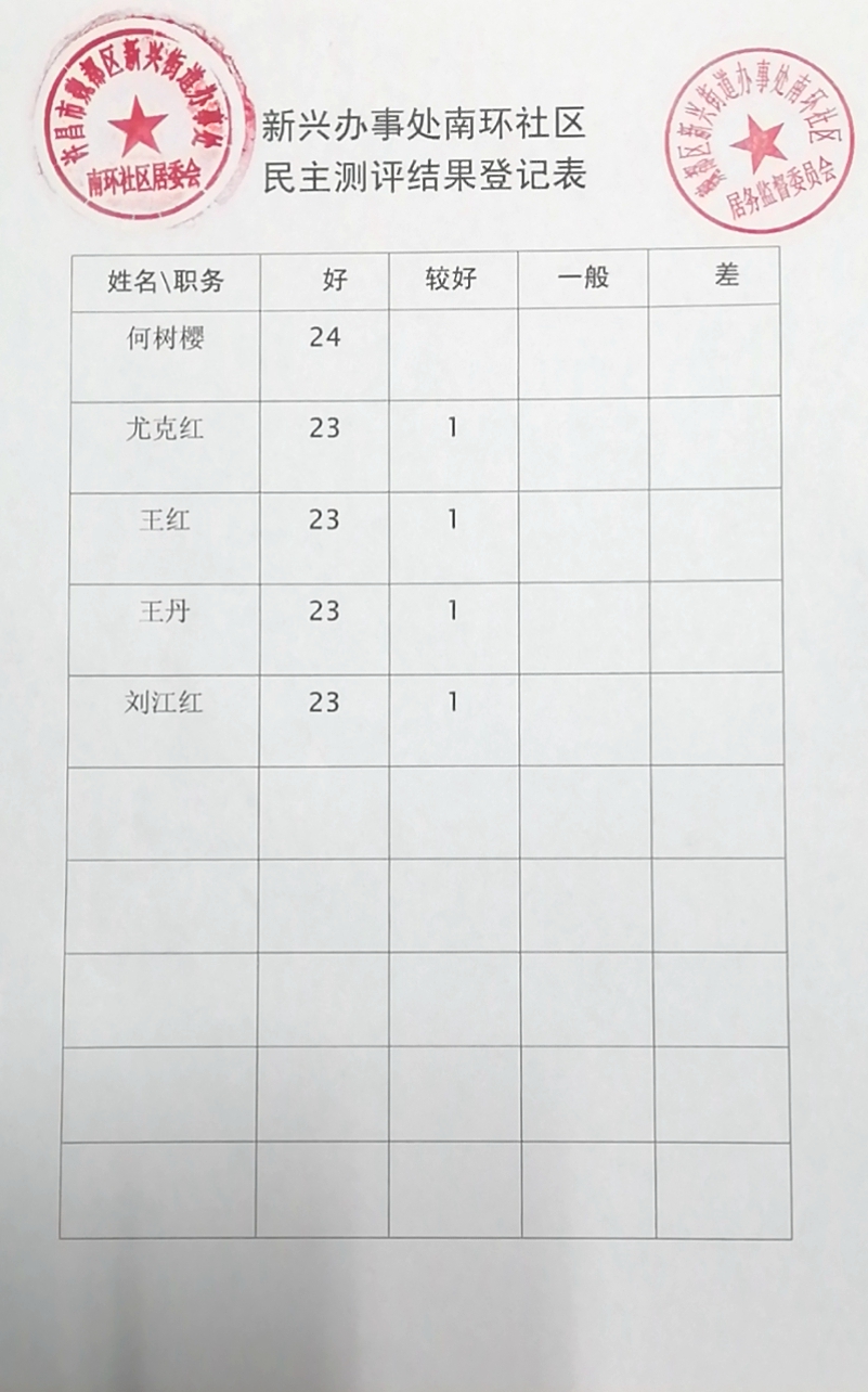 新兴办事处南环社区2019年“双报双评”评议结果公示表