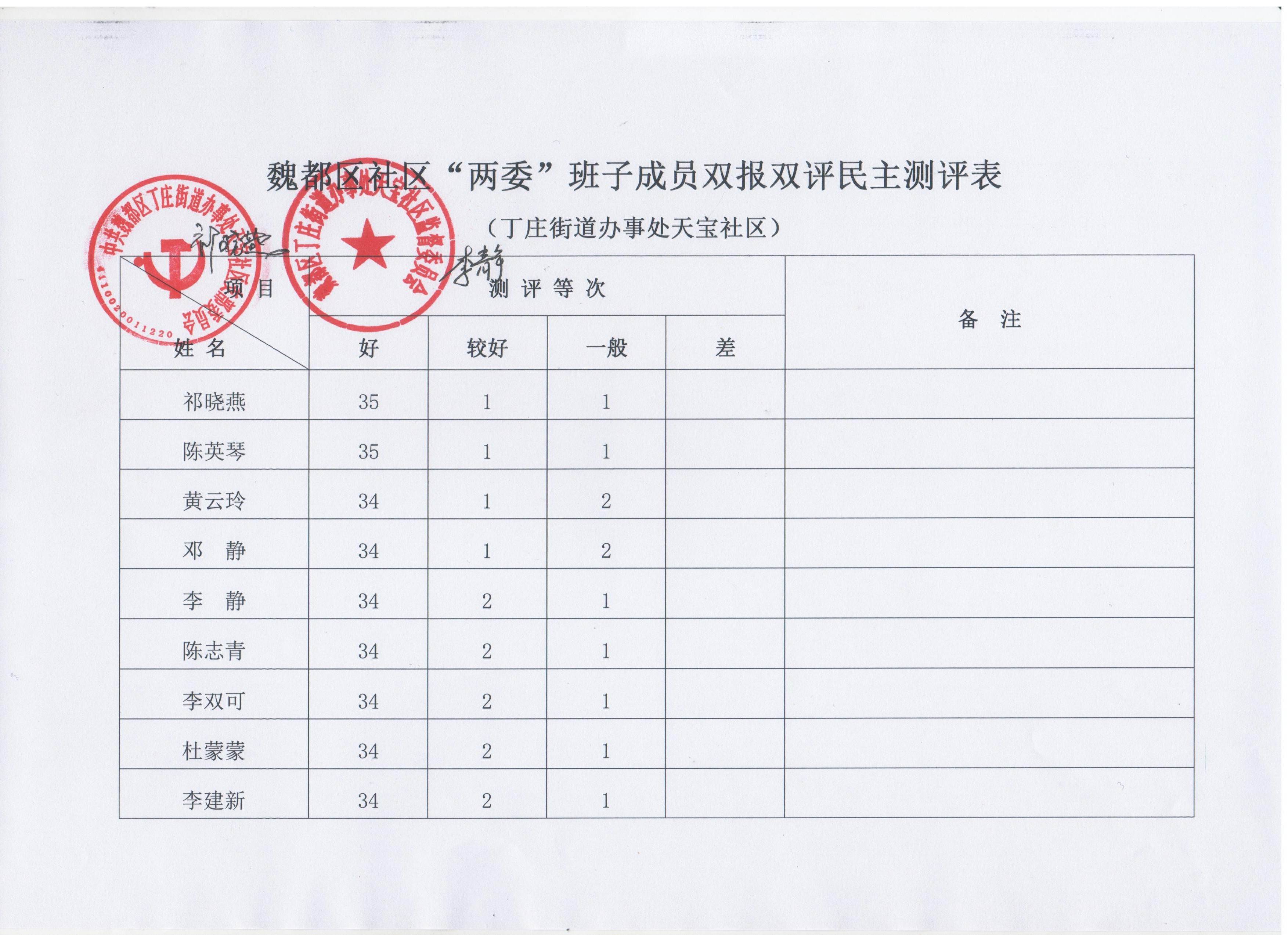 丁庄办事处天宝社区2019年“双报双评”评议结果公示表