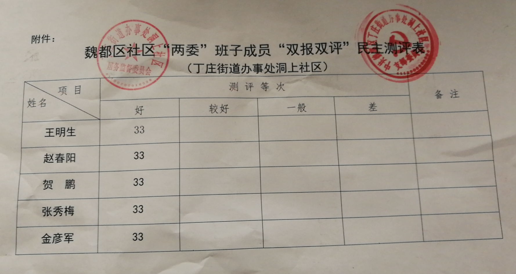 丁庄办事处洞上社区2019年“双报双评”评议结果公示表