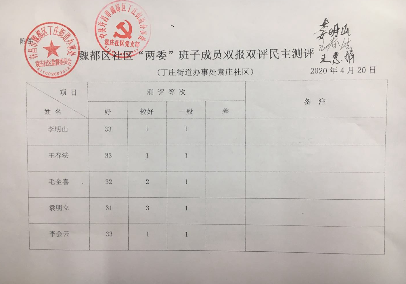 丁庄办事处袁庄社区2019年“双报双评”评议结果公示表