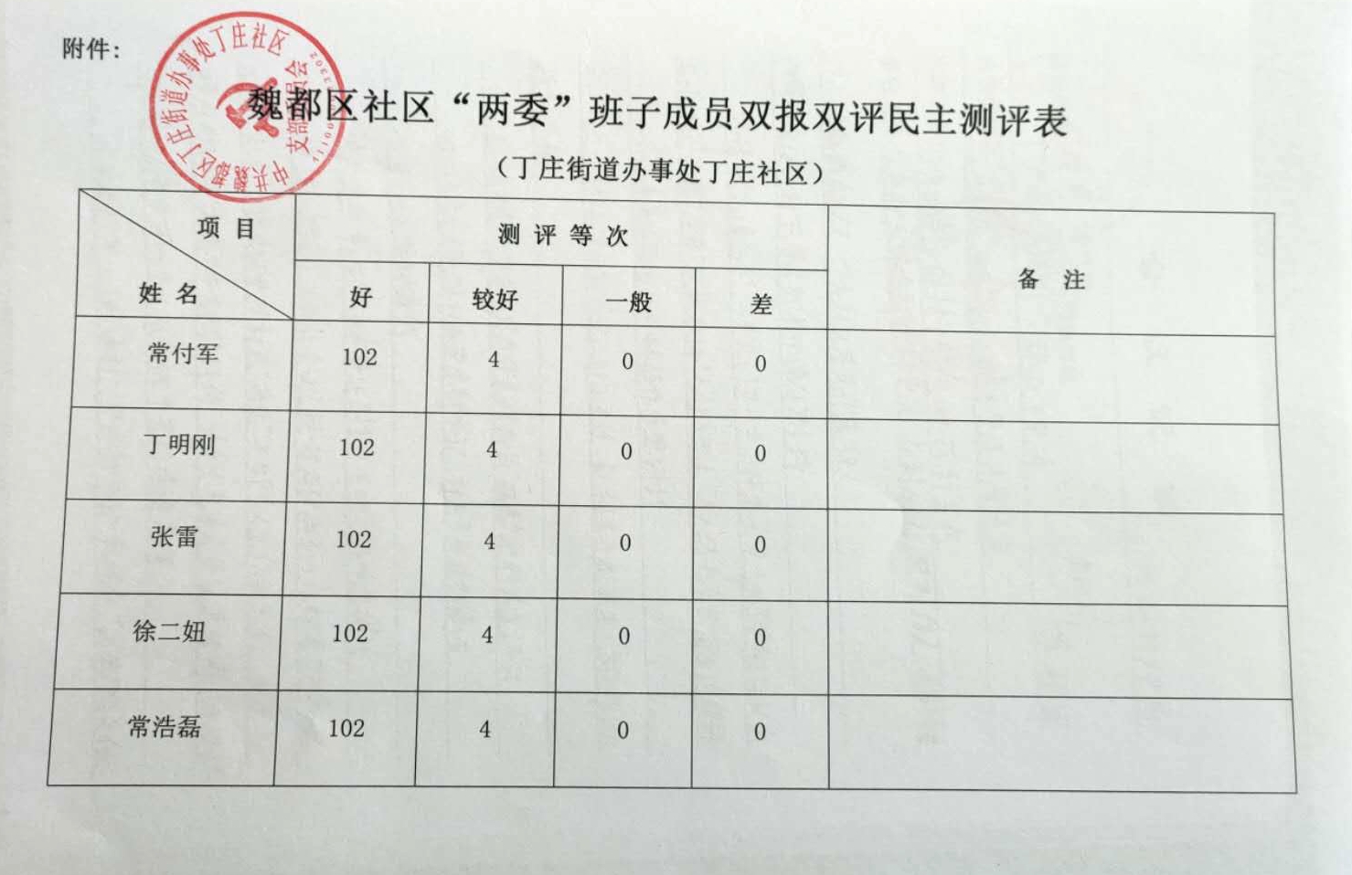 丁庄办事处丁庄社区2019年“双报双评”评议结果公示表