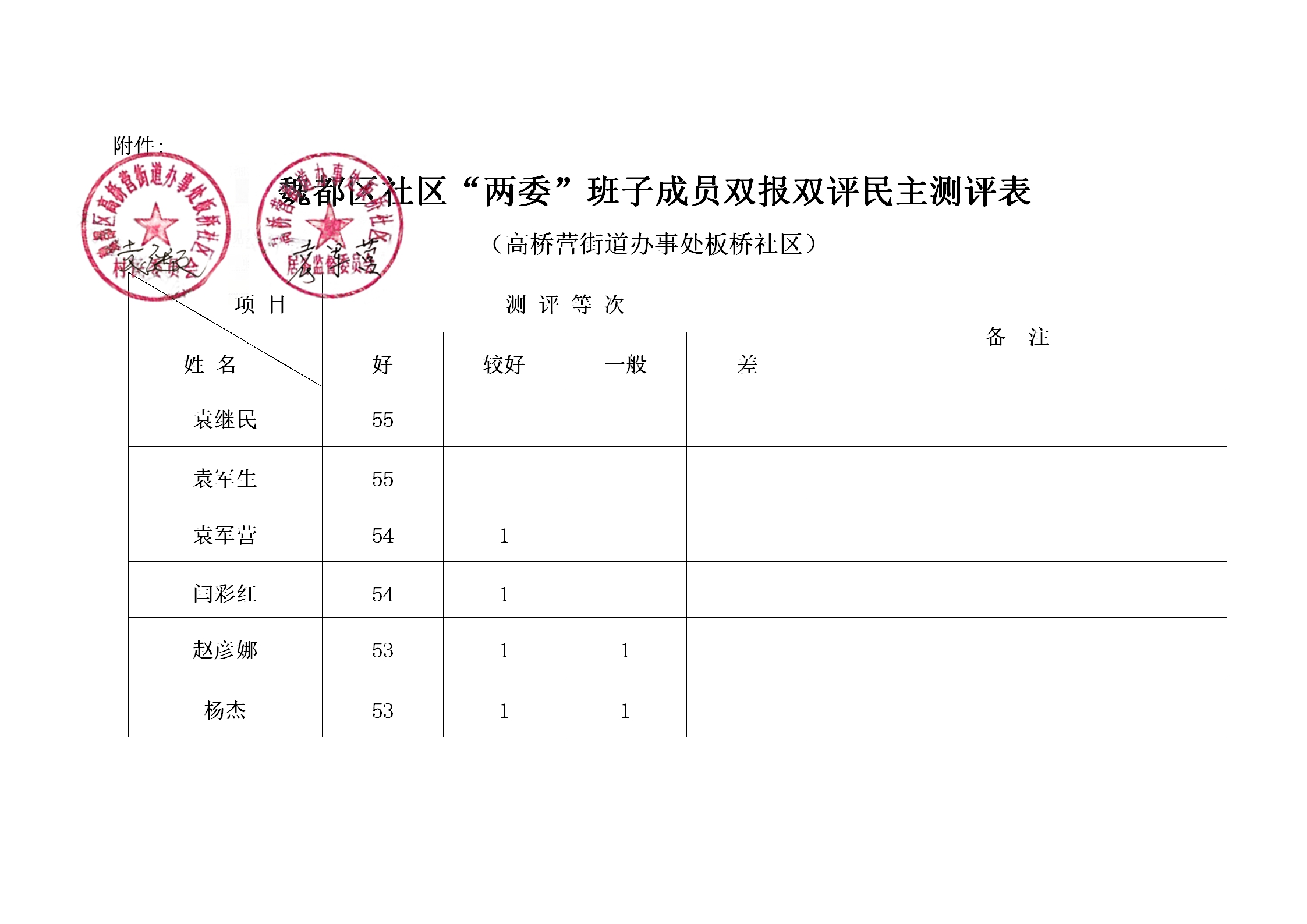 高桥营办事处板桥社区2019年“双报双评”评议结果公示表