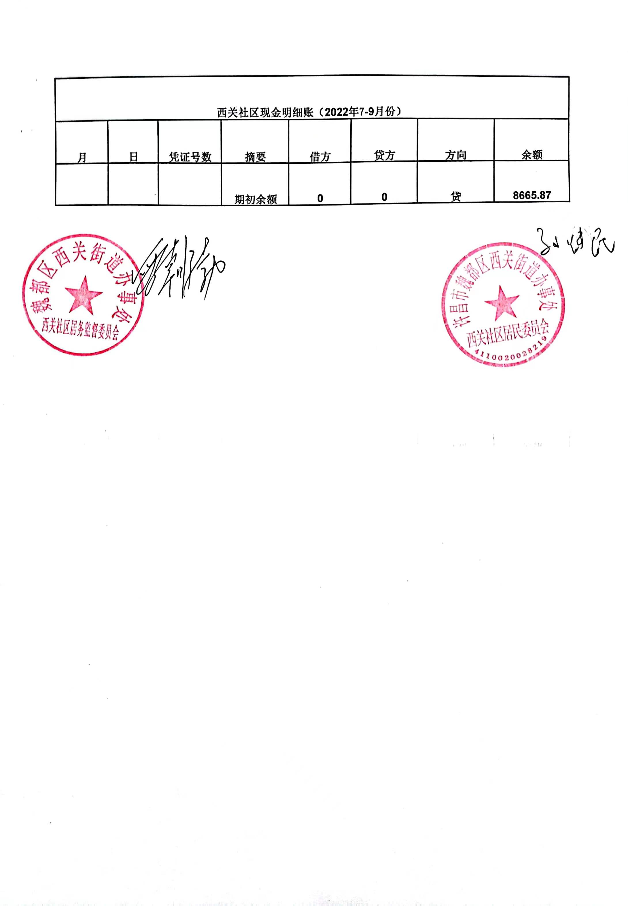 西关街道办事处西关社区2022年第三季度现金账财务公开表
