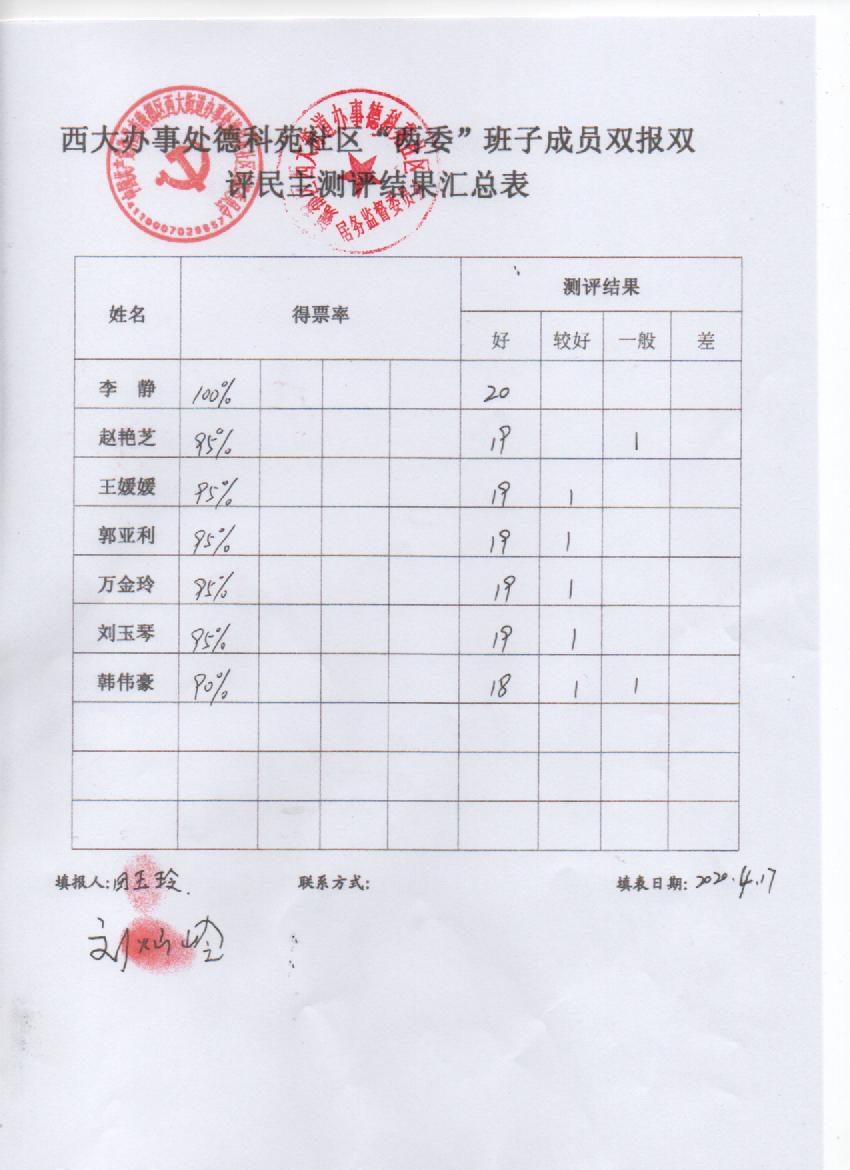 西大办事处德科苑社区2019年“双报双评”评议结果公示表
