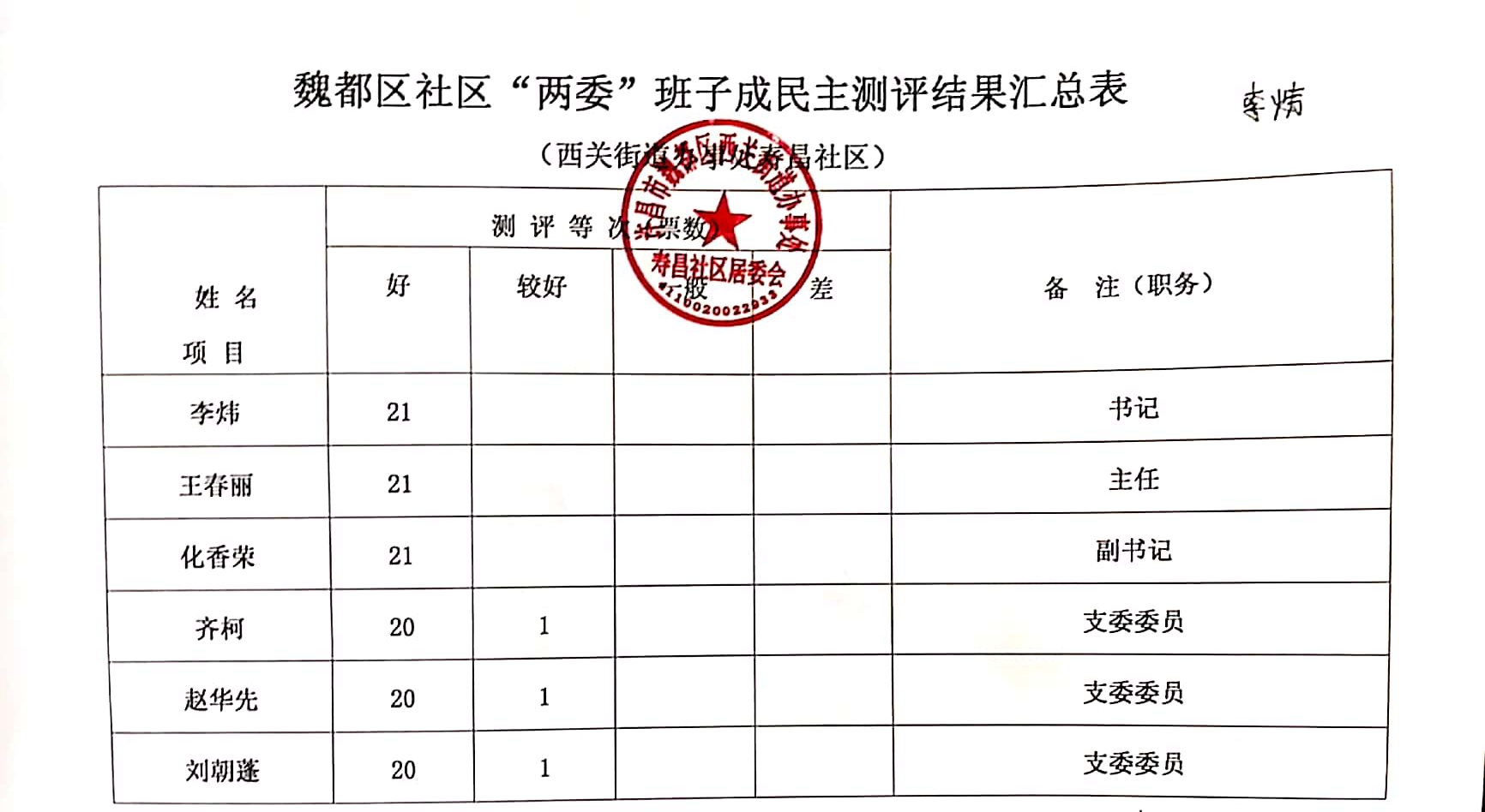 西关办事处寿昌社区2019年“双报双评”评议结果公示表