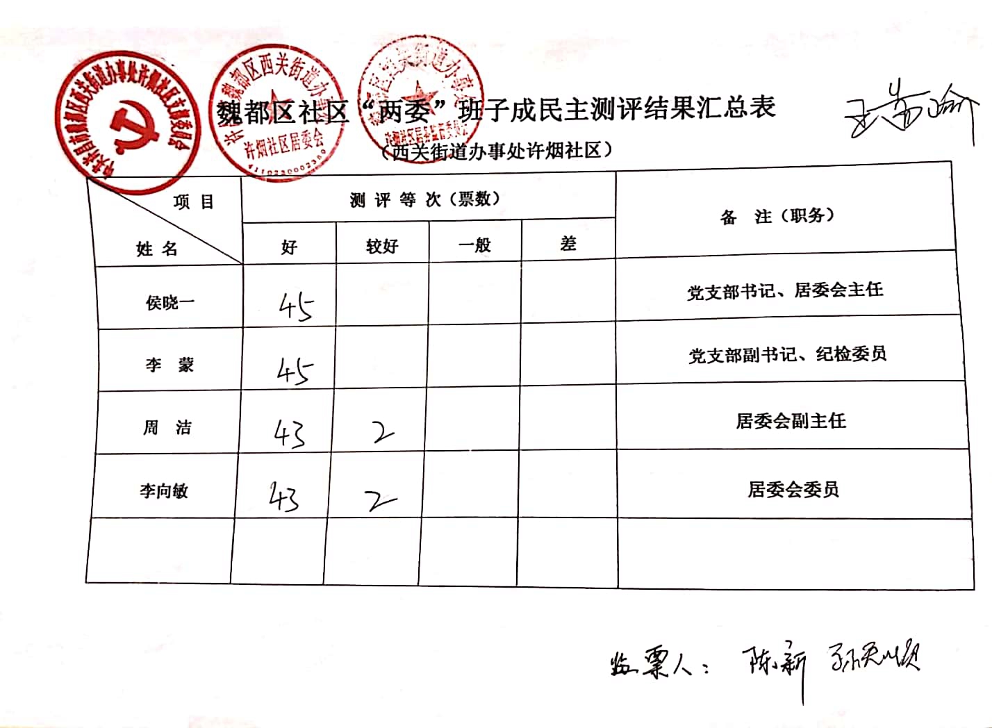 西关办事处许烟社区2019年“双报双评”评议结果公示表