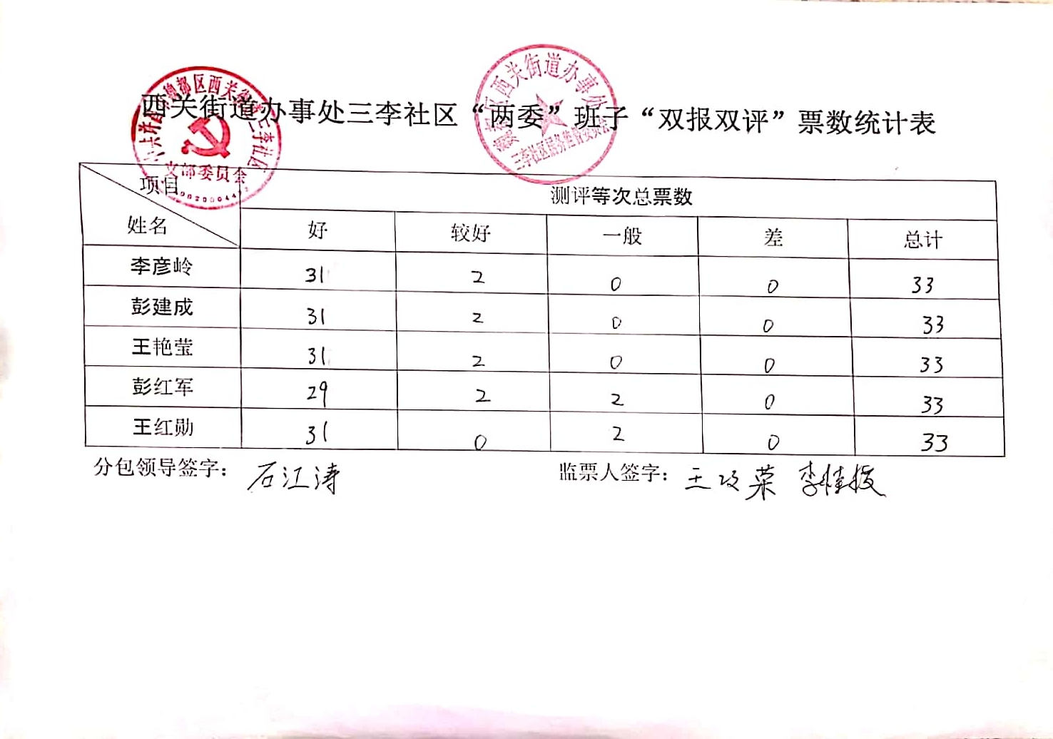 西关办事处三李社区2019年“双报双评”评议结果公示表