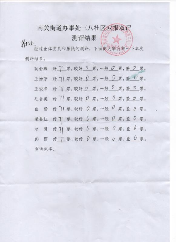 南关办事处三八社区2019年“双报双评”评议结果公示表