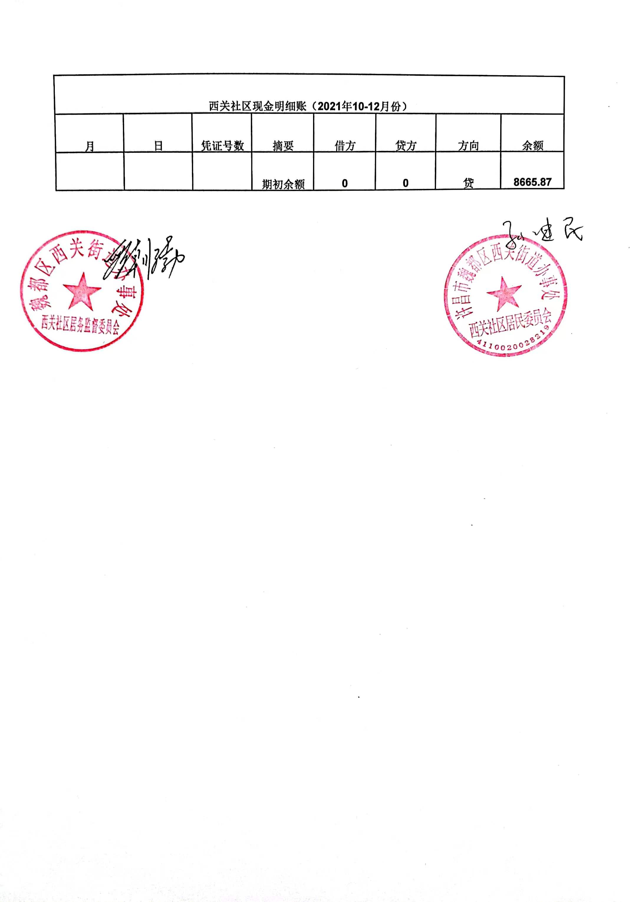 西关街道办事处西关社区2021年第四季度现金账财务公开表