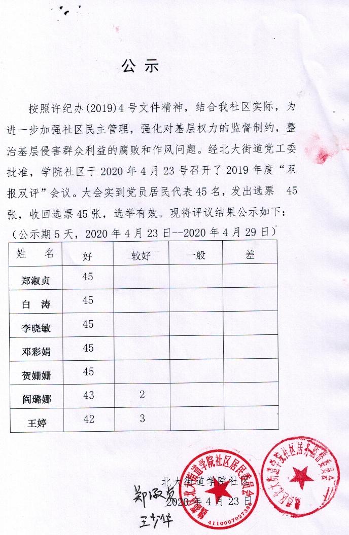 北大办事处学院社区2019年“双报双评”评议结果公示表