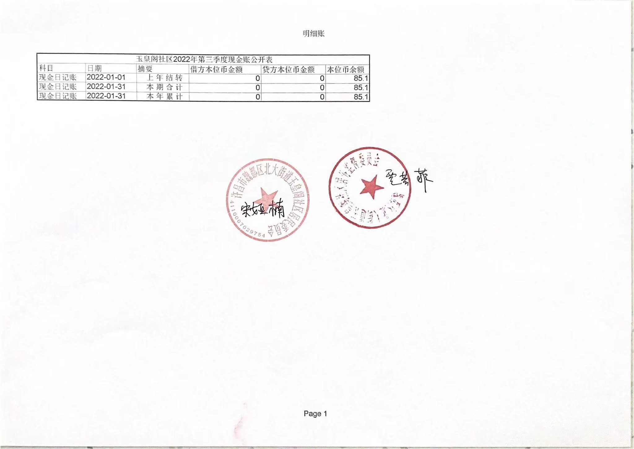 北大街道办事处玉皇阁社区2022年第三季度现金账户公开表