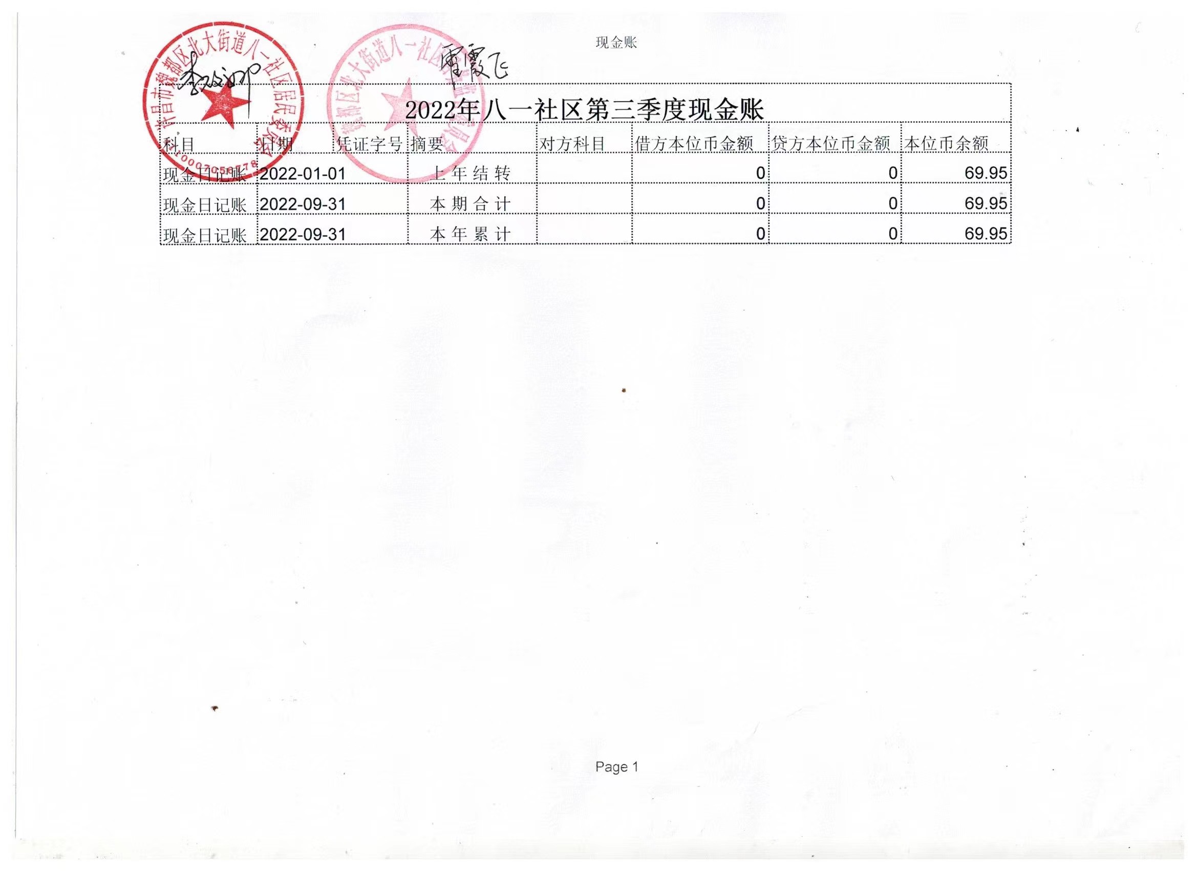 北大街道办事处八一社区2022年第三季度现金账户公开表