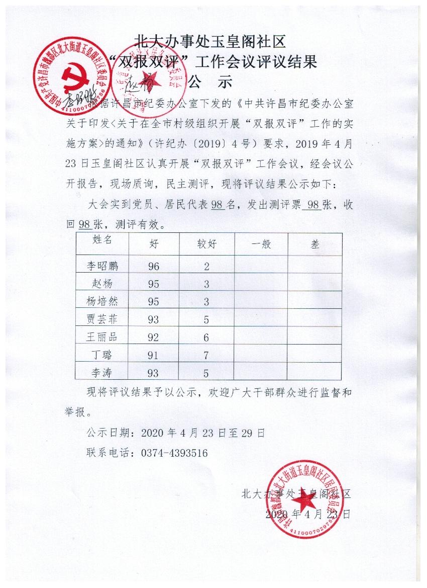 北大办事处玉皇阁社区2019年“双报双评”评议结果公示表