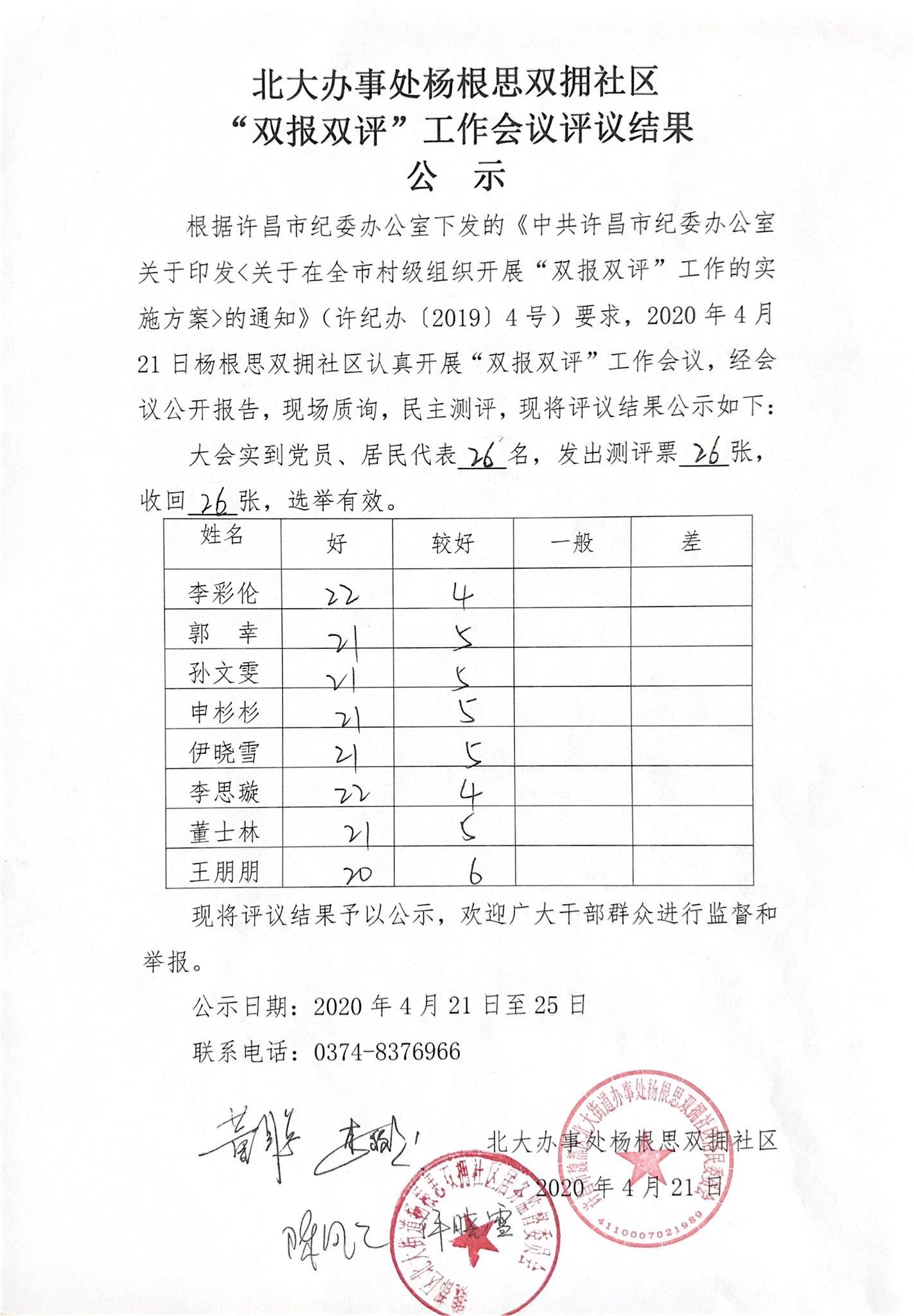 五一路办事处许继社区2019年“双报双评”评议结果公示表