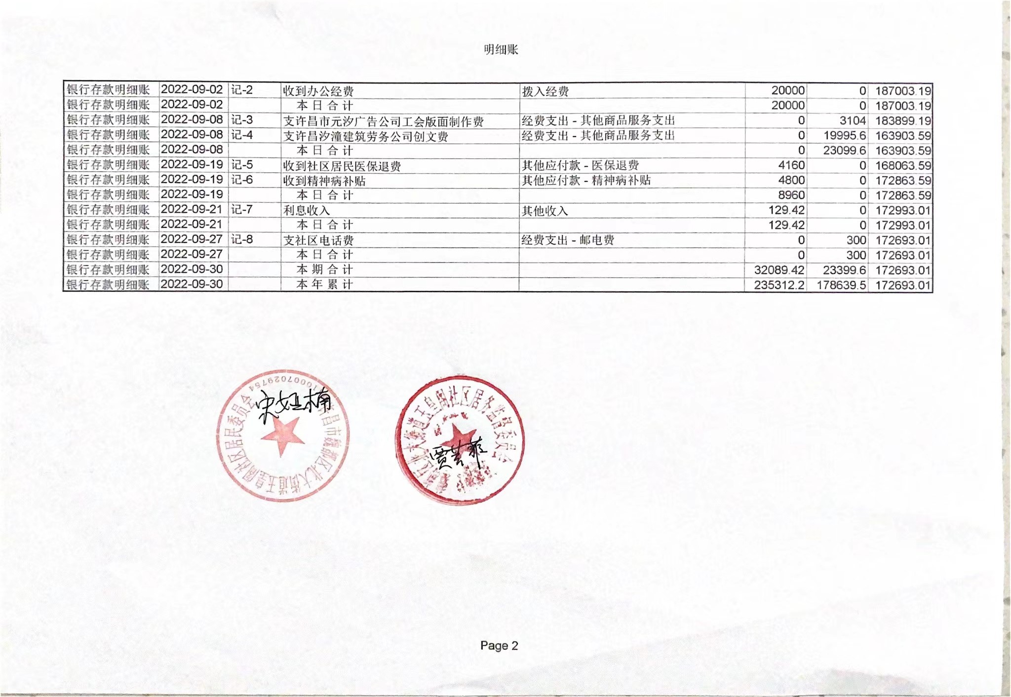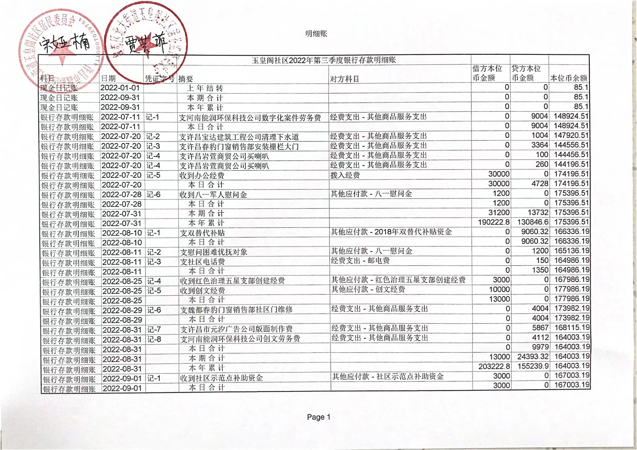 五一路办事处光明社区2022年第三季度现金、银行账户存款收支公开表