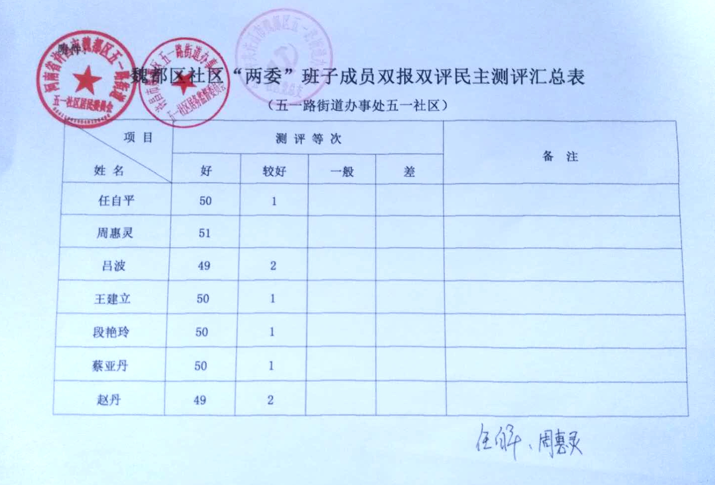 五一路办事处五一社区2019年“双报双评”评议结果公示表