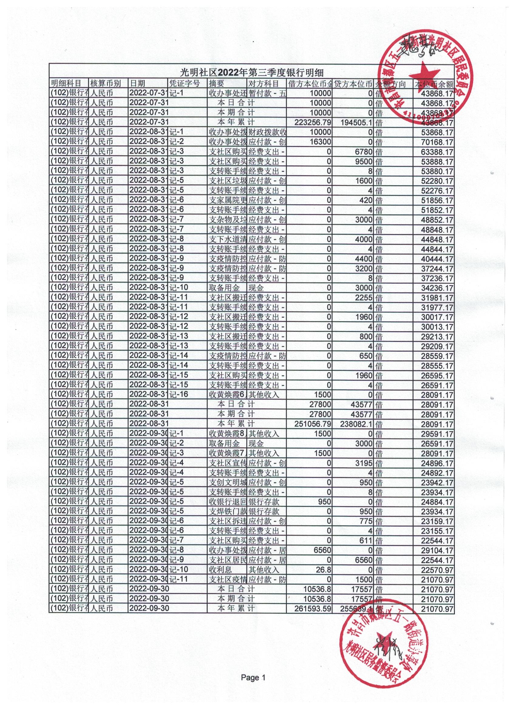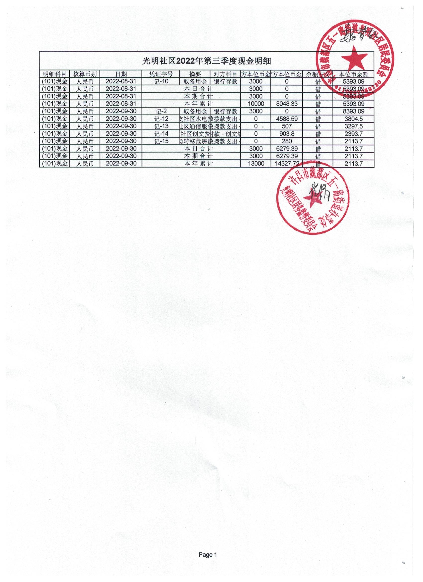 五一路办事处光明社区2022年第三季度现金、银行账户存款收支公开表