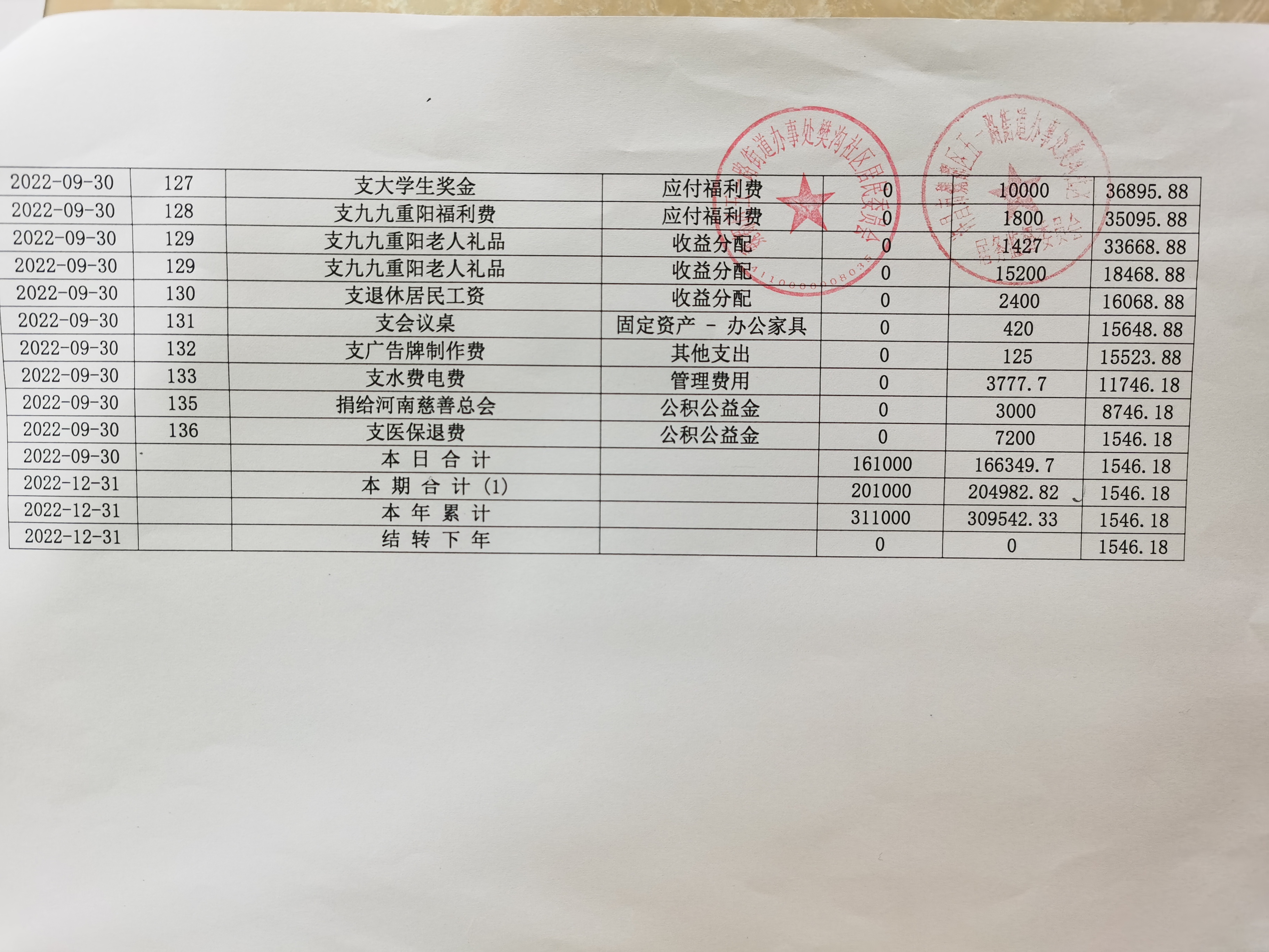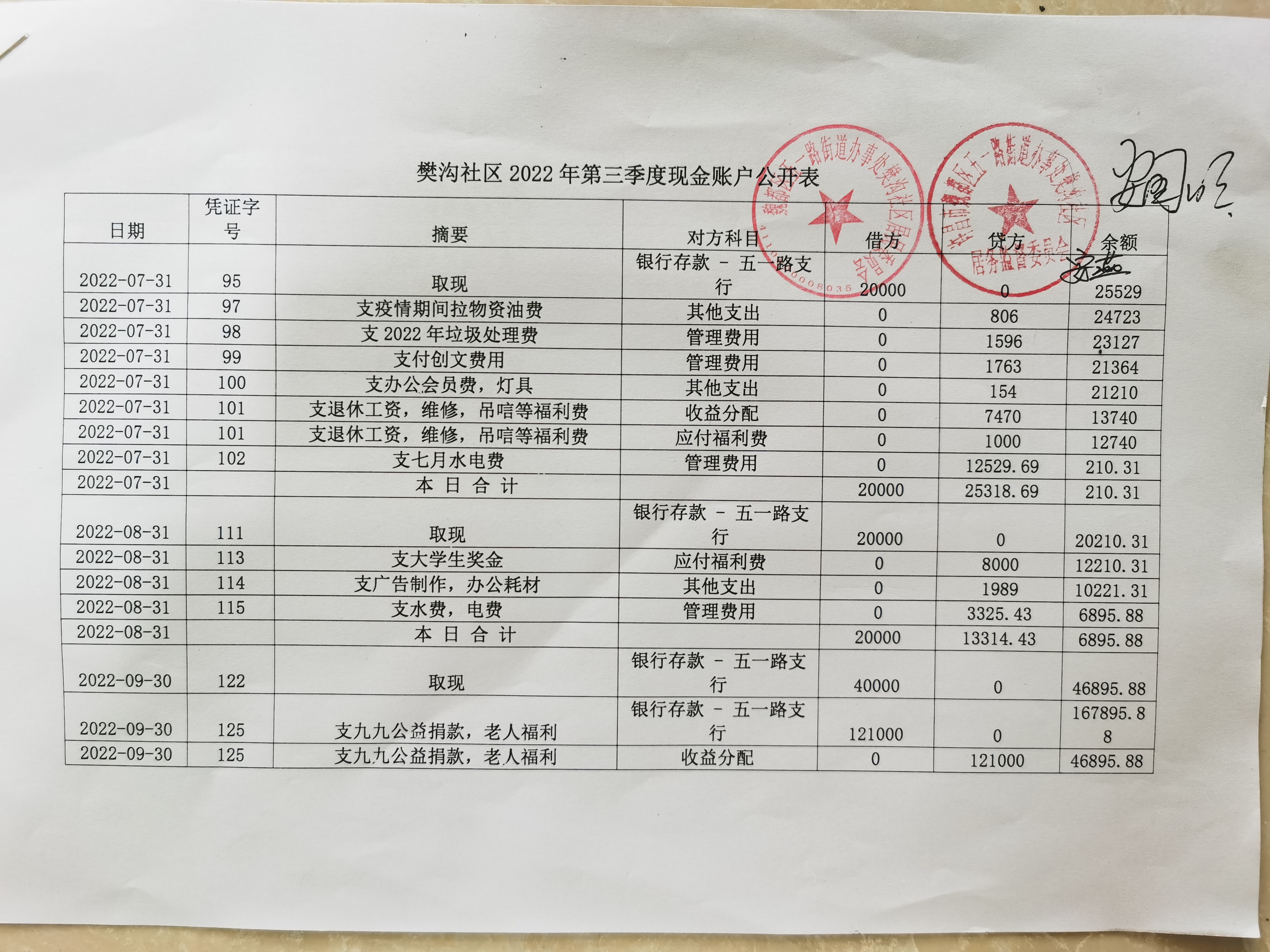 五一路街道办事处樊沟社区2022年第三季度现金账户公开表