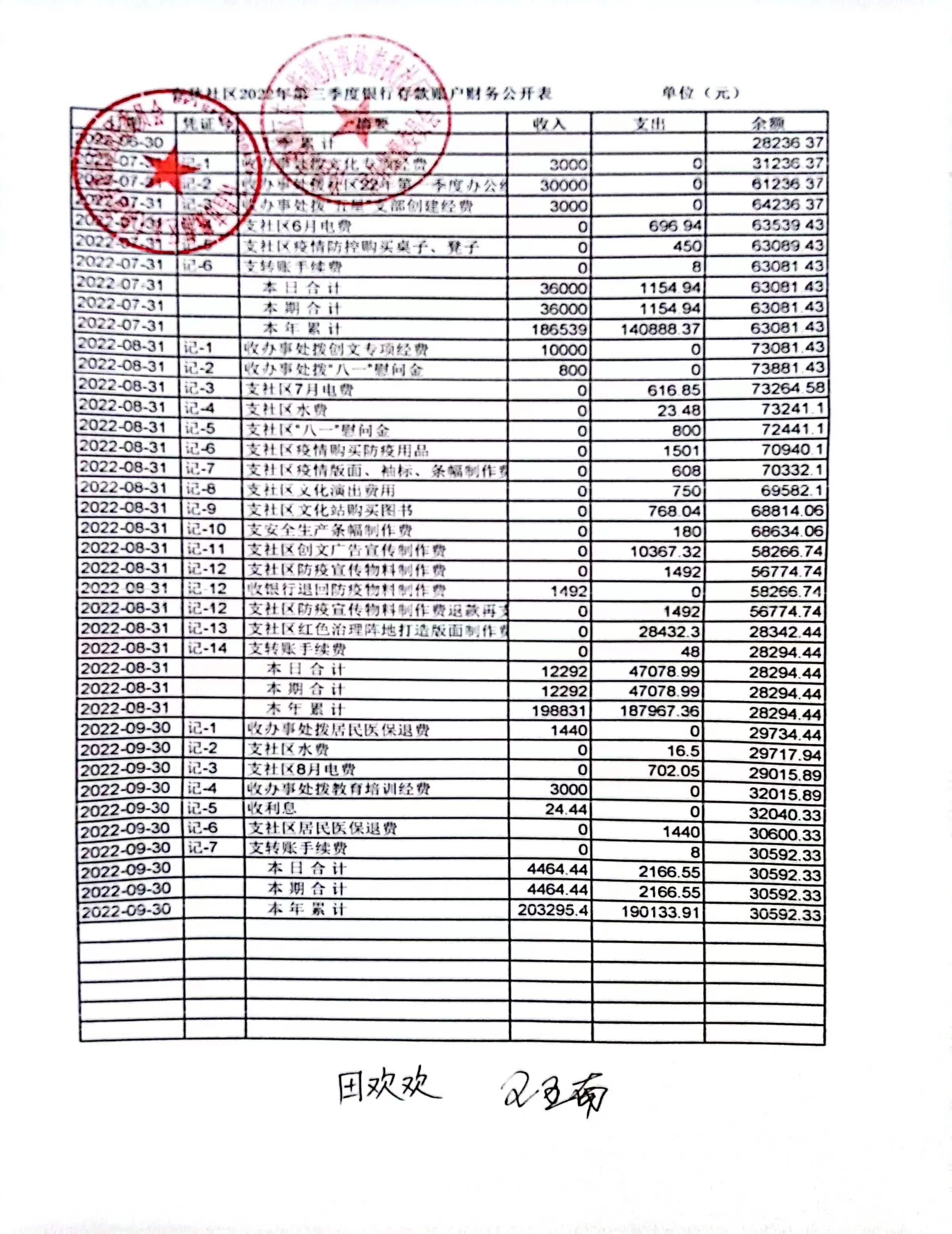 西关办事处三李社区2022年第三季度现金账户收支公开表