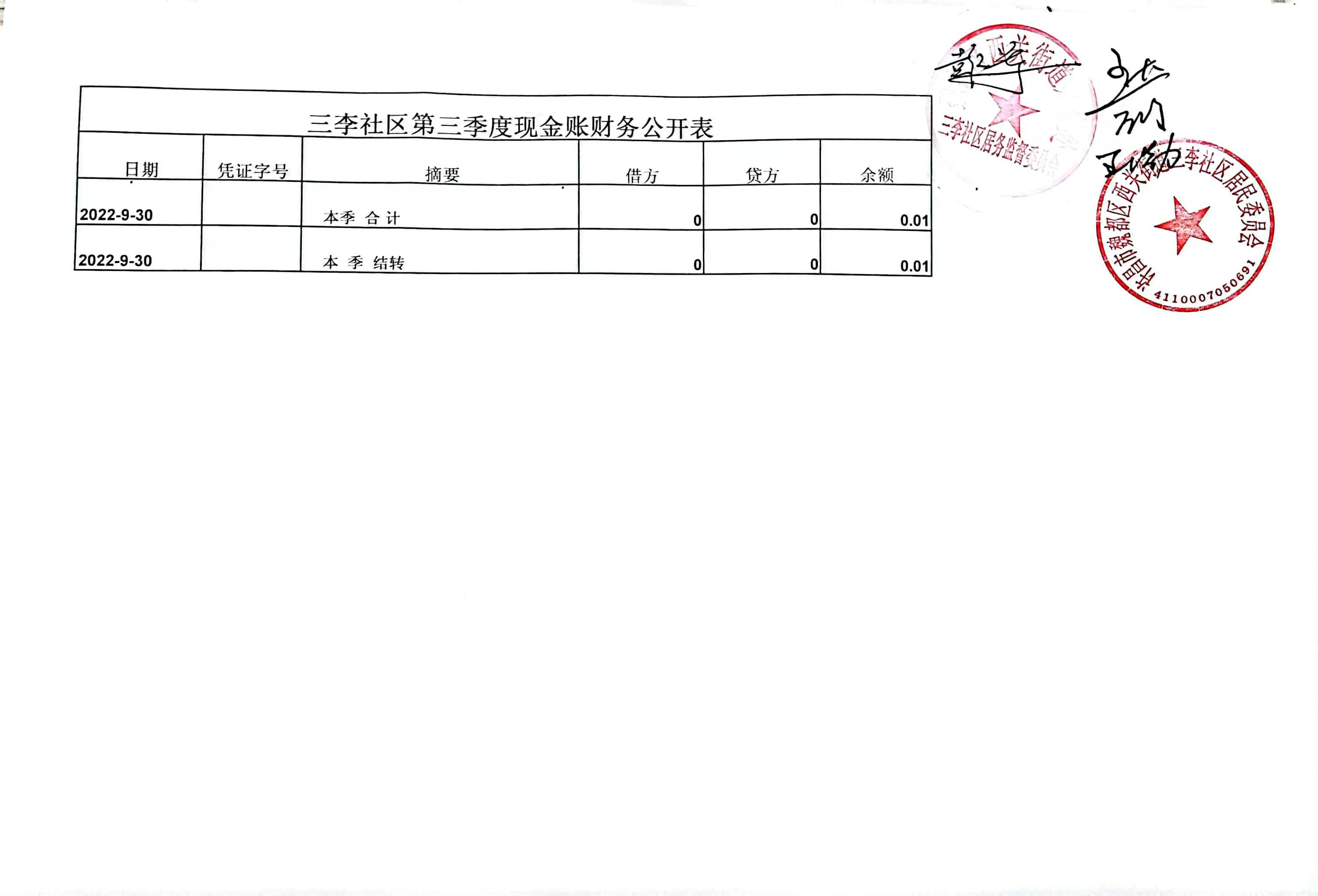西关办事处三李社区2022年第三季度现金账户收支公开表