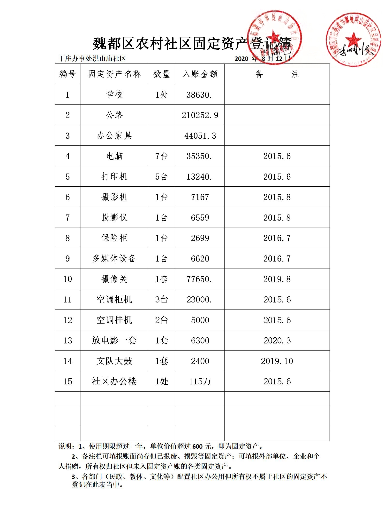 五一路办事处五一社区固定资产登记簿
