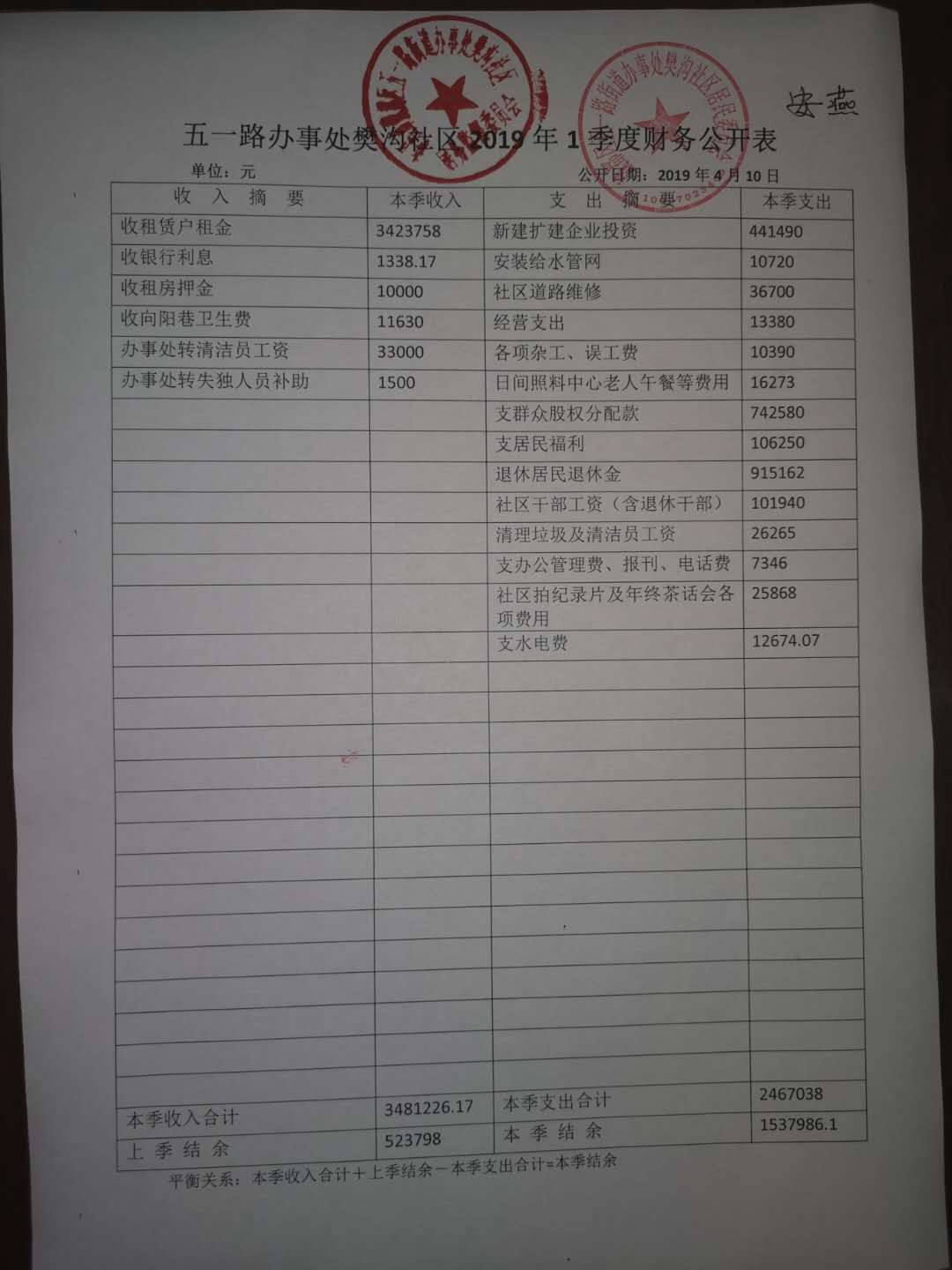 五一路办事处樊沟社区2019年第一季度财务公开表