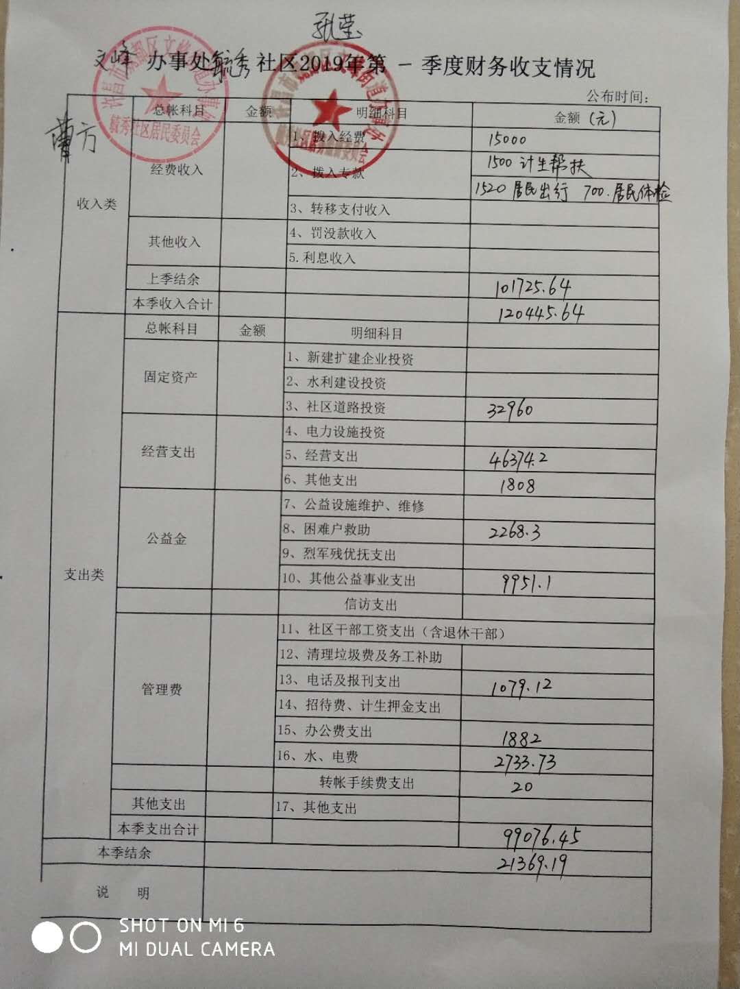 文峰办事处毓秀社区2019年第一季度财务公开表