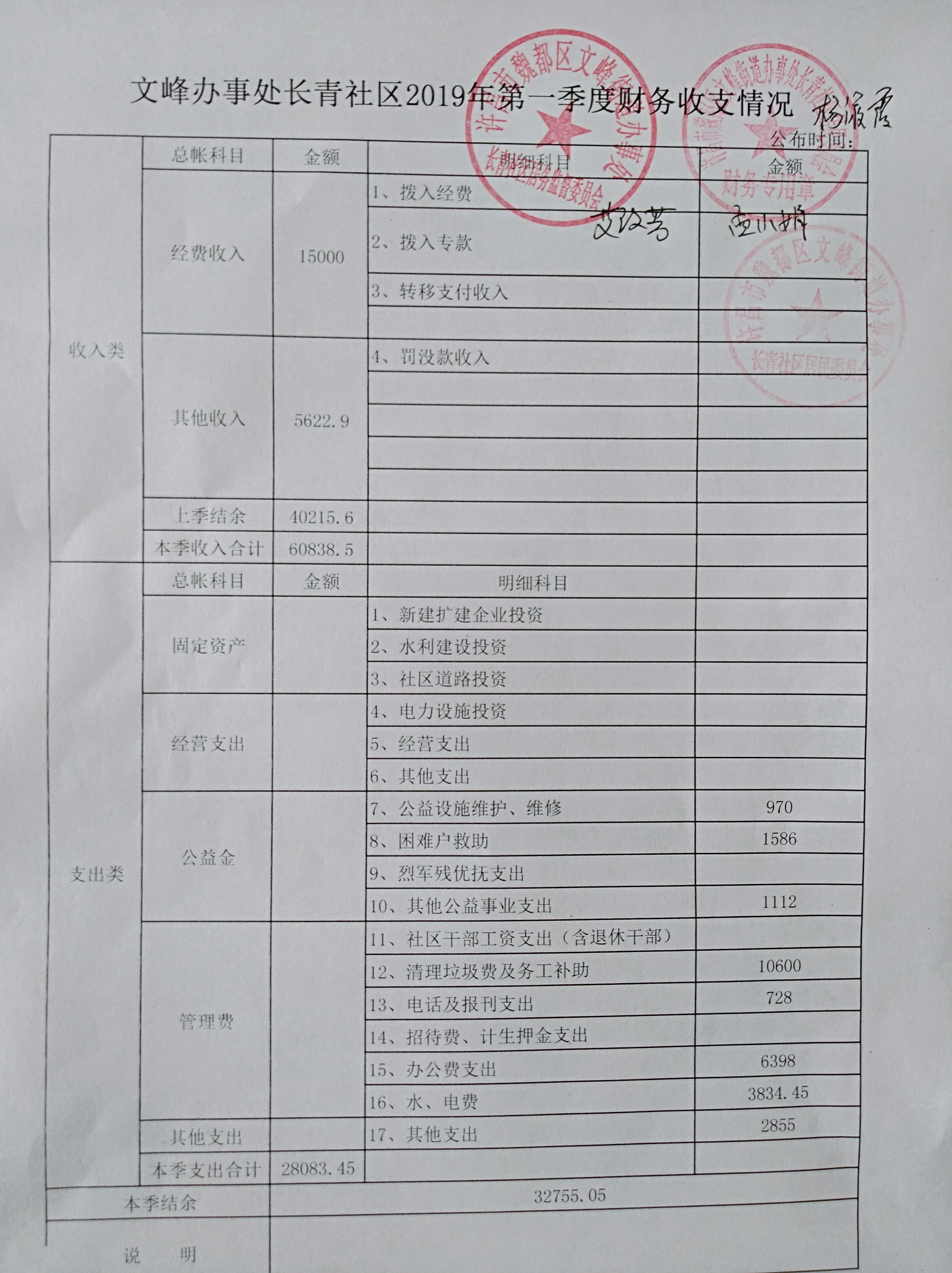 文峰办事处长青社区2019年第一季度财务公开表
