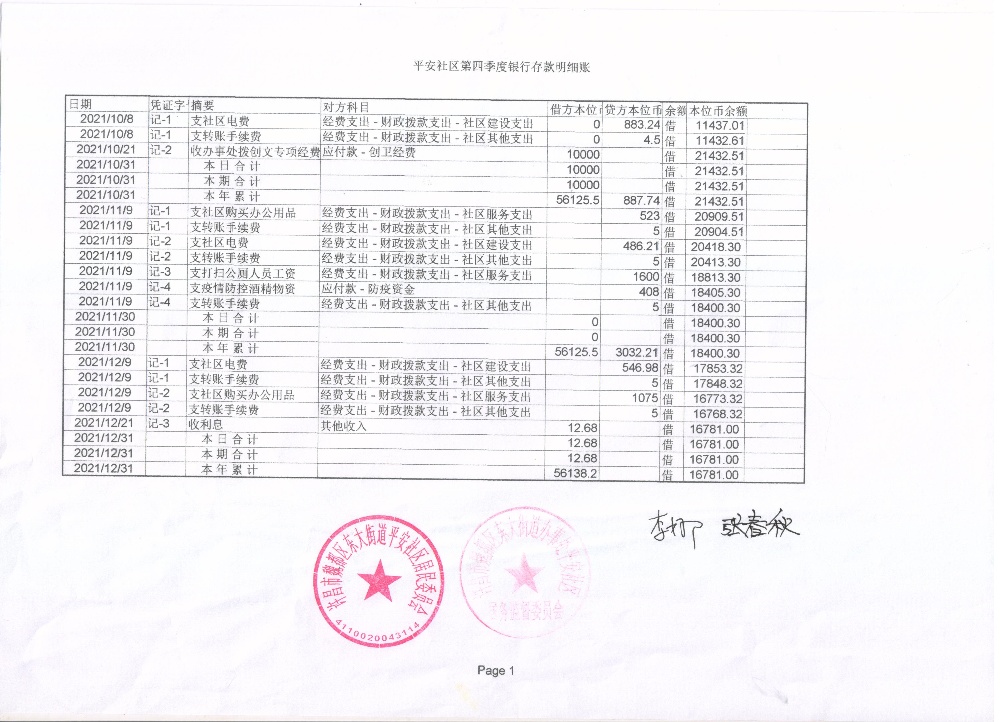 东大街道办事处平安社区2021年第4季度银行存款公开表