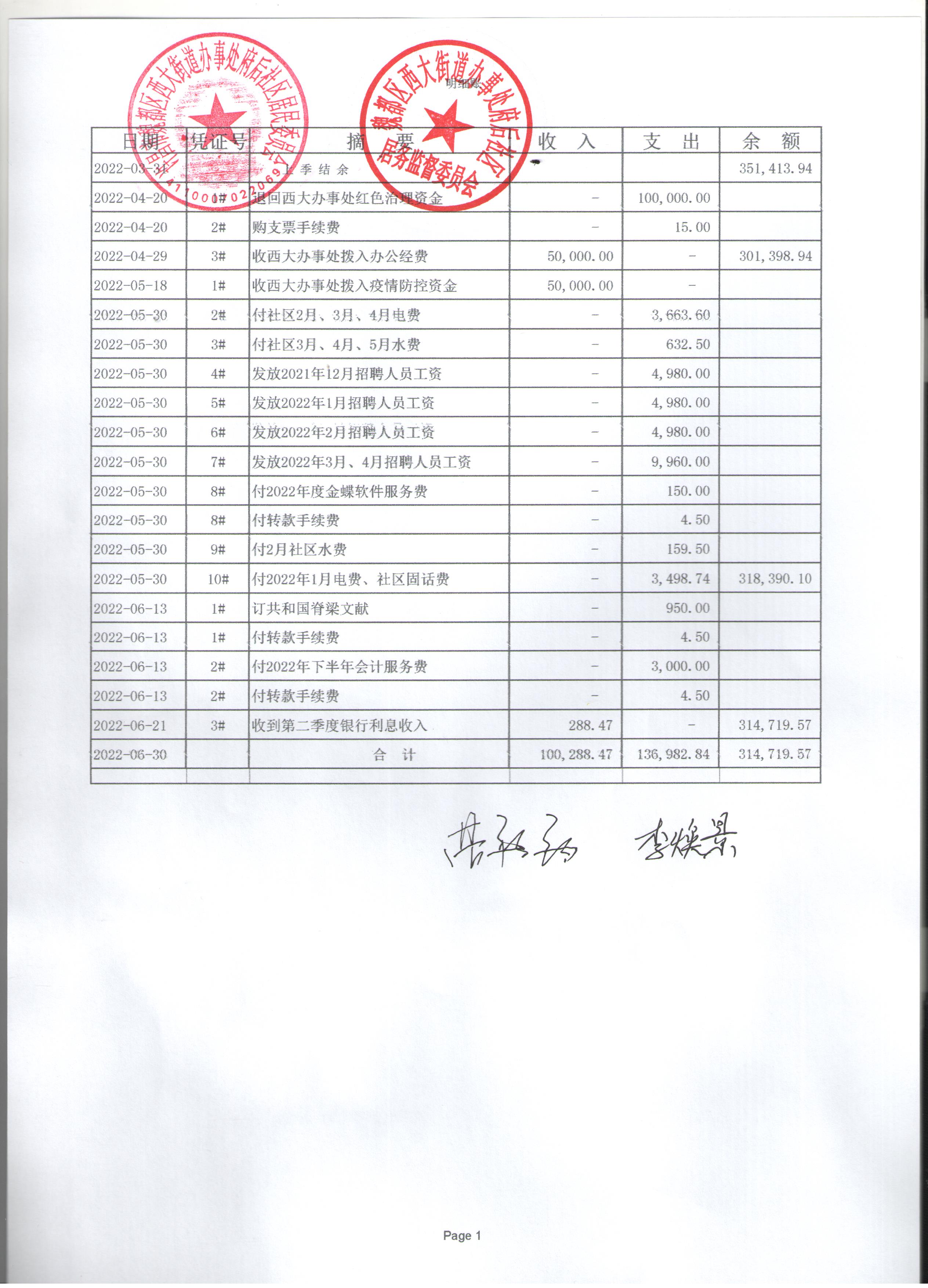 西大街道办事处府后社区2022年第二季度现金、银行存款账户公开表