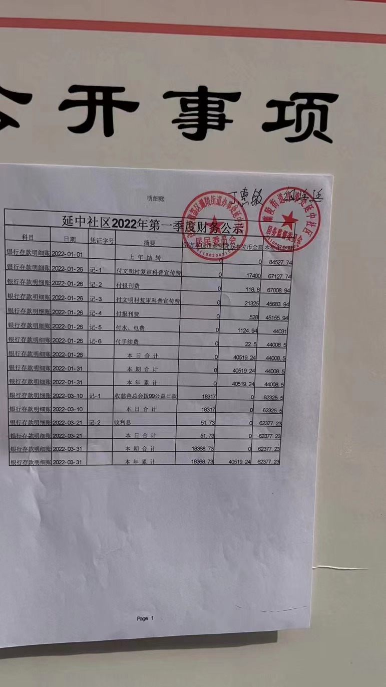 灞陵办事处延中社区2022年第一季度银行存款公示表