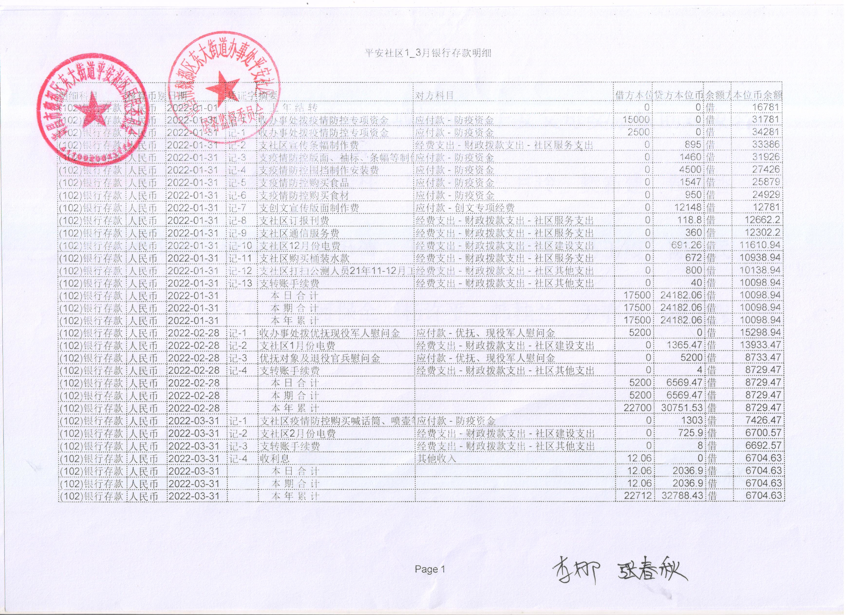 东大街道办事处平安社区2022年第1季度银行存款公开表